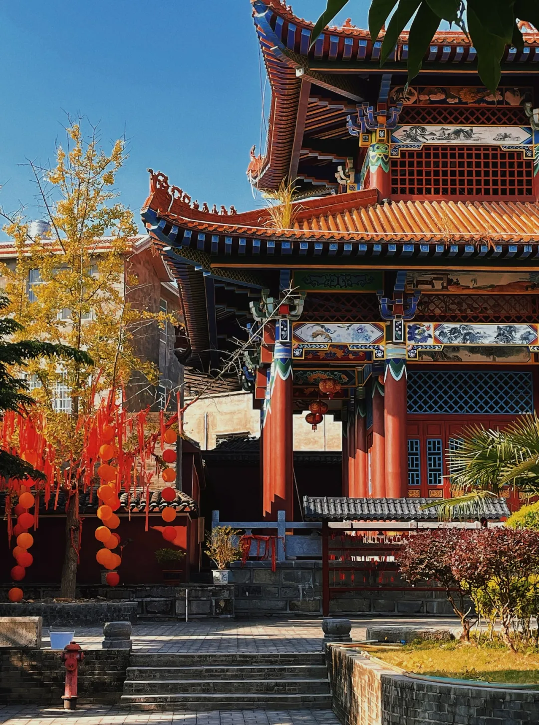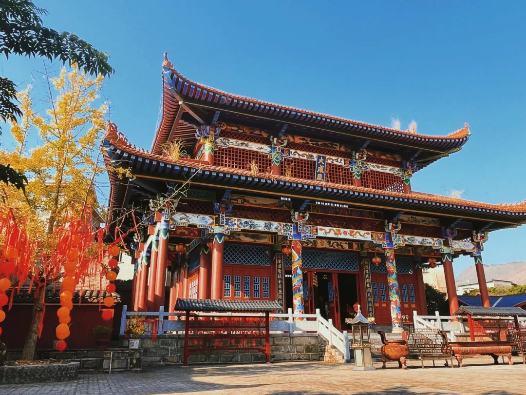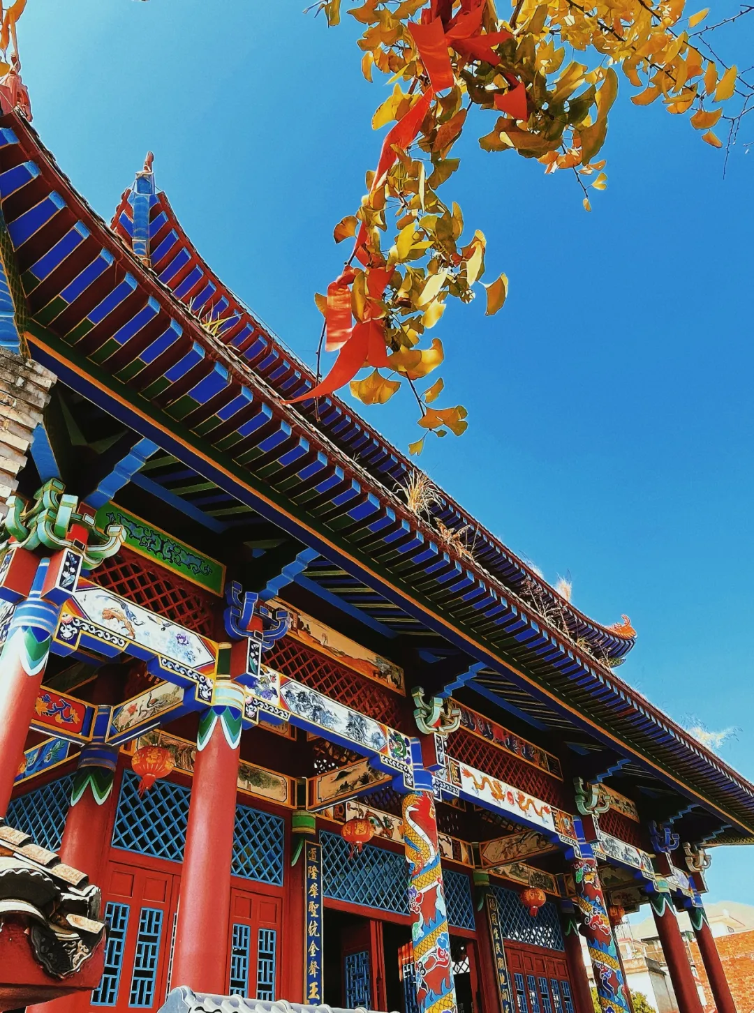 古建筑与金黄色的银杏叶相互映衬,