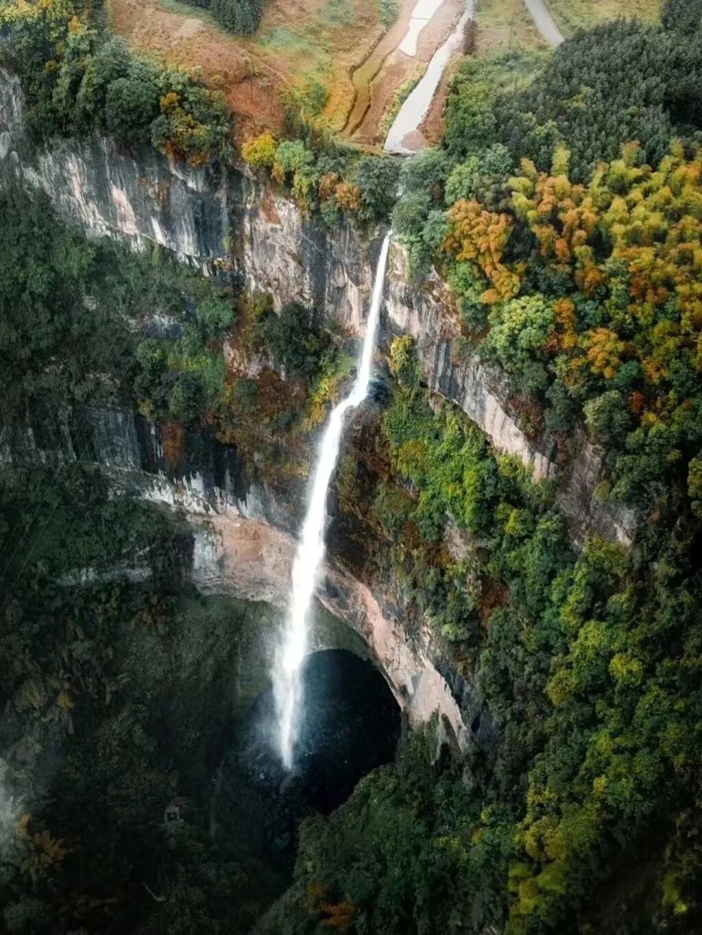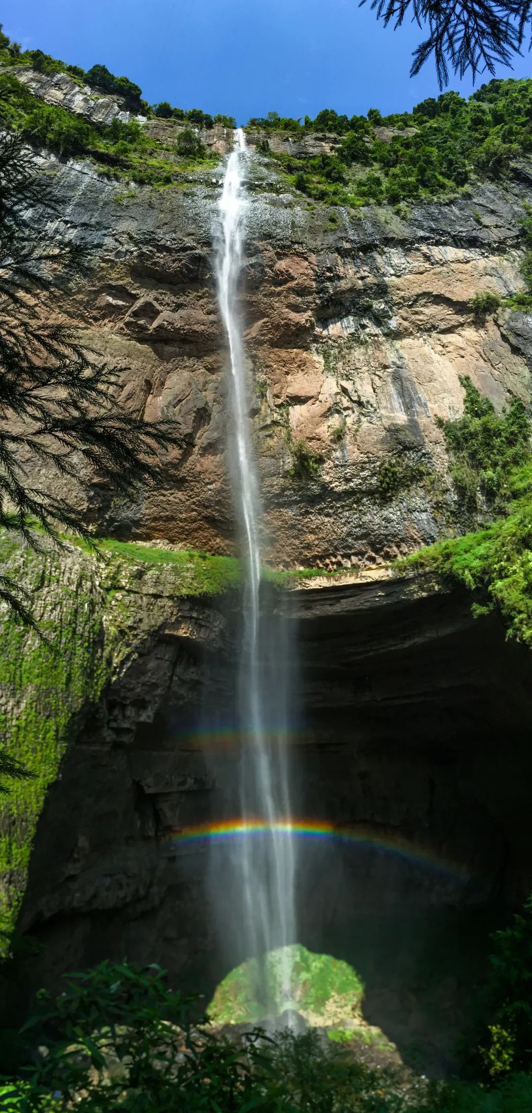 硝斗岩瀑布天坑是目前四川已知的第一大天坑瀑布,天坑整体呈北西—南东走向,岩壁陡且高,几乎直立,从岩顶到最低处深度达400米,有瀑布飞流直下,声如雷动。