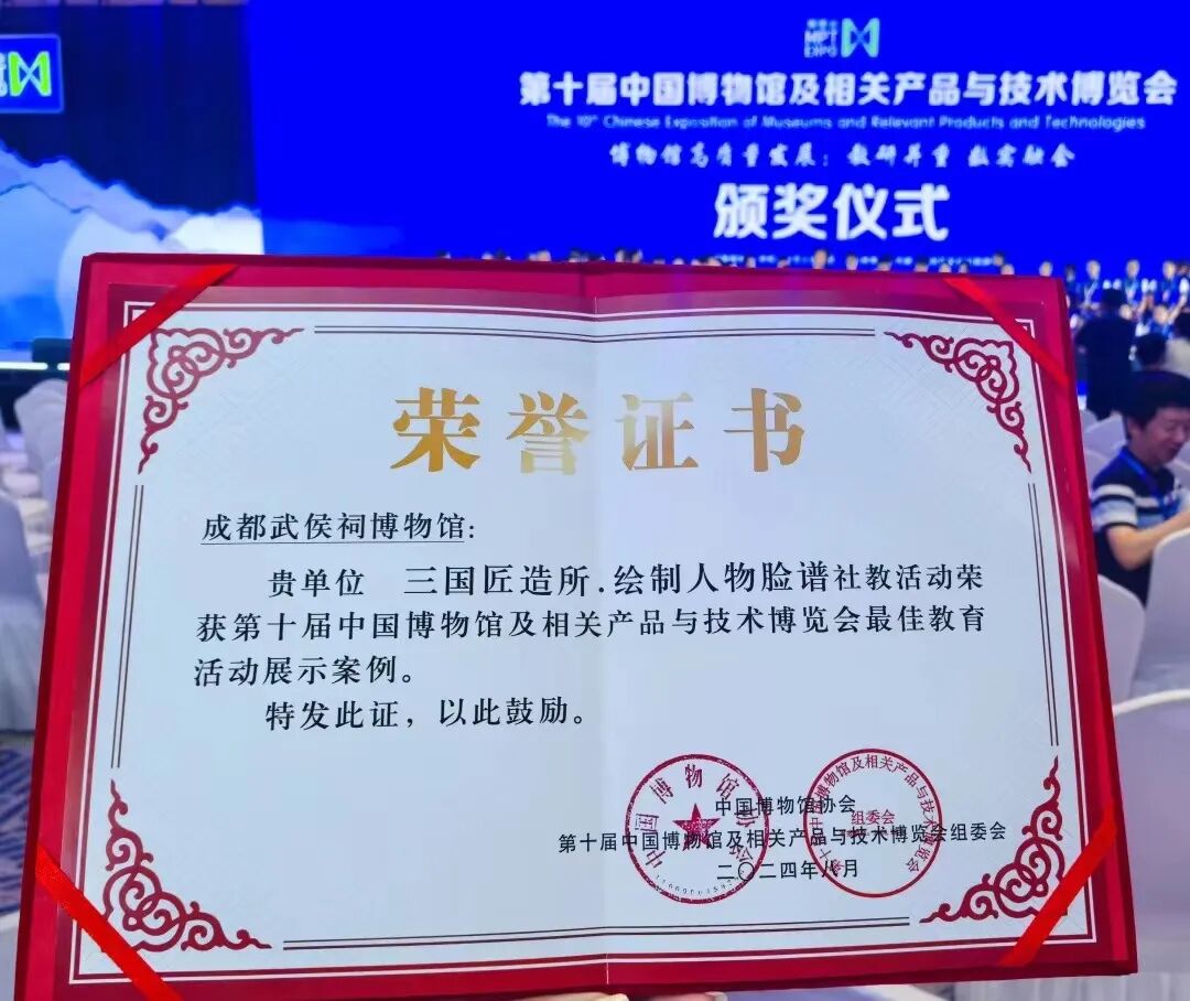 8月26日,经评选,“三国匠造所”喜获中国博物馆协会、第十届“博博会”组委会颁发的“最佳教育活动展示案例”奖项。武侯祠博物馆通过持续推出高品质、多元化的社教活动,满足公众的精神文化需求,将中华优秀传统文化深植于公众的心中。