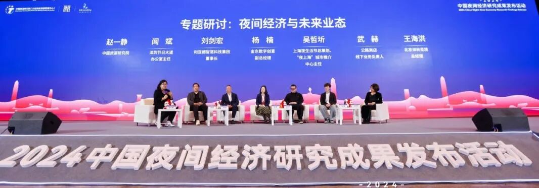 在“夜间经济与未来业态”专题研讨环节,开元文化旅游开发管理有限公司总经理褚锋平,INS新乐园联合创始人关山行进行了专题分享。深圳节日大道办公室主任闻斌、利亚德智慧科技集团有限公司董事长刘剑宏、金东数字创意股份有限公司副总经理杨楠、“夜上海”城市推介中心主任吴哲圻、公路商店线下业务负责人武赫、北京深林觅境旅游开发有限公司总经理王海洪围绕夜间经济与未来业态的企业实践、产品生态构建与未来发展路径等进行了讨论。