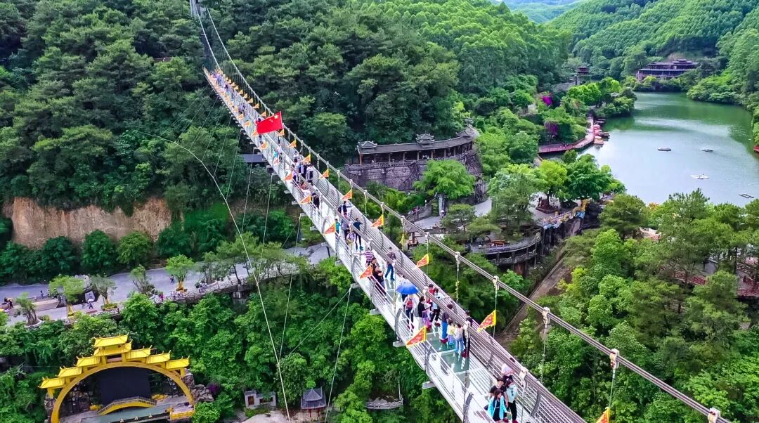 ⚫ 全透明高空观景玻璃桥,高悬于两座高山之间,两峰地势险峻,中间峡谷横穿,峡谷天堑,壮观而惊险。