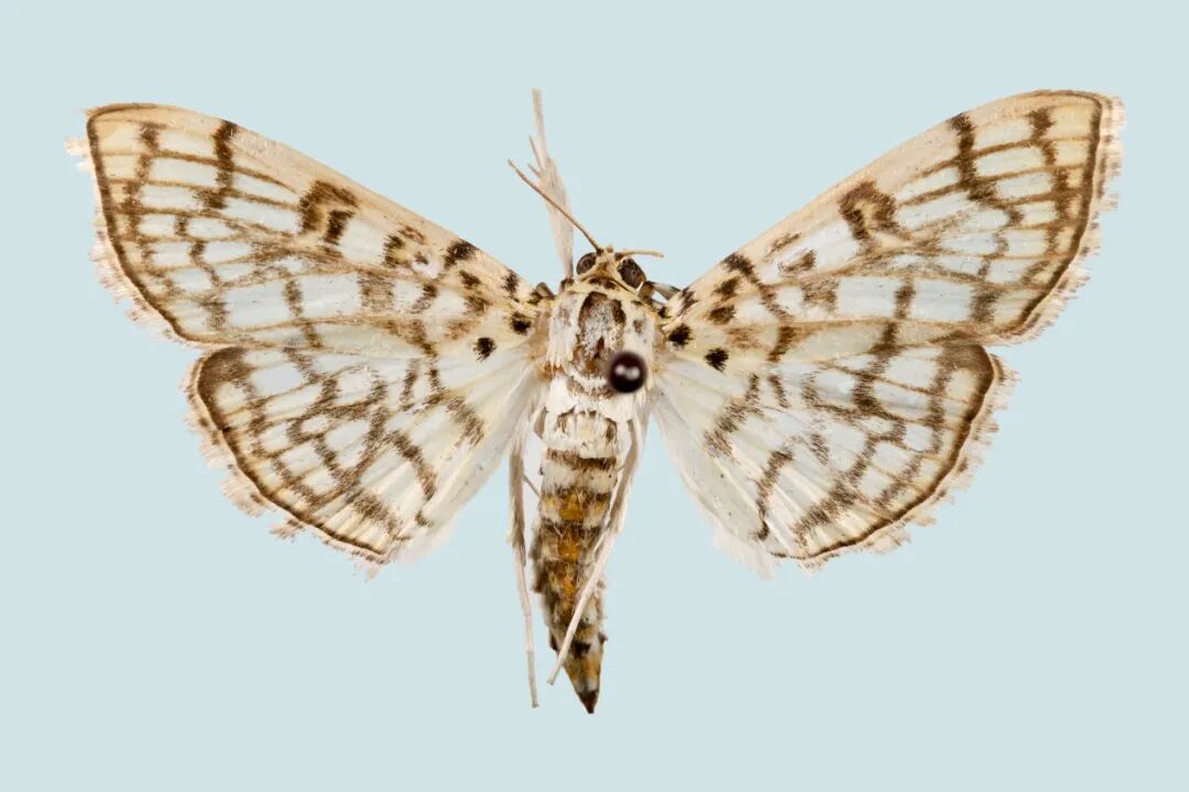 近日,泰山工作人员采集到一种中小型蛾类,其外形与椴树上的一种重要害虫——棉褐环野螟极为相似。经山东农业大学曲爱军副教授鉴定,确认其为草螟科斑野螟亚科褐环野螟属的Haritalodes basipunctalis,系中国新纪录种,并命名为泰山基点褐环野螟。注:图片中央暗褐色圆点为标本制作工具昆虫针,并非昆虫身体结构。(曲爱军 摄影)