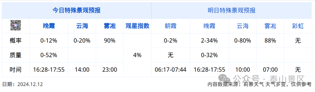 经会商研判,12月12日夜间至13日,泰山盘道、旅游公路、观景平台等或将出现较大范围的雨雪、大风、降温等现象,存在较大安全隐患,13日晨日出概率低。为切实保障中外游客的安全与健康,决定自12月12日16:00起,泰山景区各游览线路暂停开放,恢复开放时间另行通告。