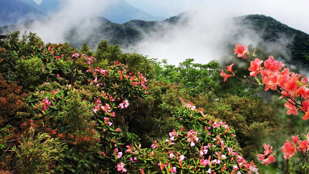 当你踏入猫儿山,就仿佛踏入了一个现实版的《山海经》世界。沿着蜿蜒的山路前行,首先映入眼帘的是峰顶那块巨大的花岗岩巨石,它犹如一只卧猫,身姿矫健,神态栩栩如生,仿佛在守护着这片神奇的土地,猫儿山也正是因此而得名。周边云雾缭绕,如同轻纱般缠绕在巨石与山峰之间,如梦如幻,让人不禁怀疑自己是否置身于仙境之中。再往山中深入,丰富的植被令人目不暇接,1436种野生植物在这里肆意生长,谱写着生命的华章。其中,36种杜鹃花在不同的季节绽放出绚丽的色彩,红的似火,粉的如霞,白的像雪,它们点缀在山林之间,为猫儿山增添了一抹灵动与娇艳。
