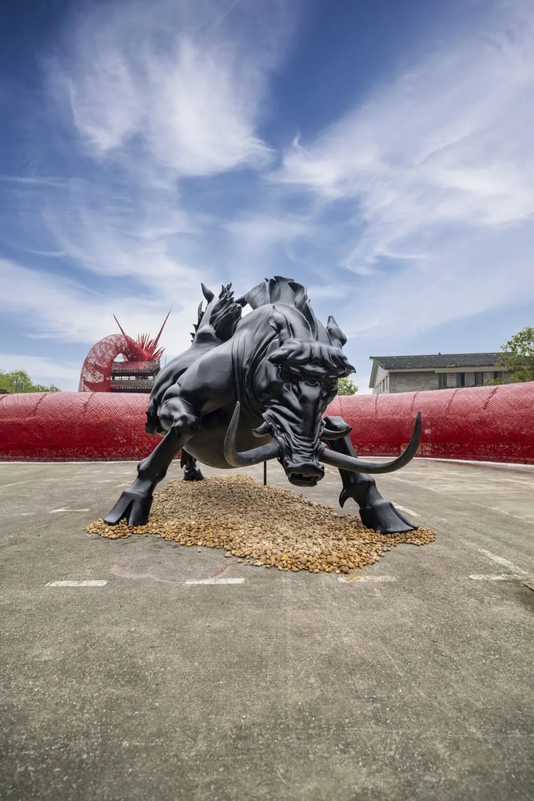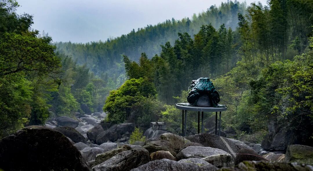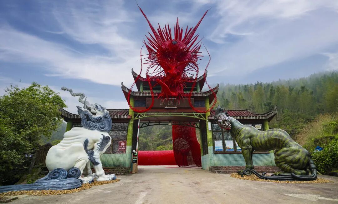 “招摇谷”的大门便是一件震撼人心的艺术品,巨大的 “烛龙”造像盘踞其上,它双目如炬,身体蜿蜒,鳞片在阳光下闪烁着神秘的光芒,仿佛下一秒就要腾空而起。每一个来到这里的游客,都会被这栩栩如生的造像所吸引,不由自主地停下脚步,细细端详,惊叹于工匠们的精湛技艺与奇思妙想。穿过 “烛龙” 蜿蜒的身体,一个神秘的异次元空间豁然展现在眼前。幽静的山谷中,混沌、梦貘、白泽、类等 “神兽” 或立或卧,或隐或现,它们与园区内的竹林、瀑布、水潭等天然景观相得益彰。阳光透过竹叶的缝隙洒下,形成一片片金色的光斑,落在神兽的身上,更增添了几分神秘的氛围。瀑布奔腾而下,水花四溅,发出震耳欲聋的声响,仿佛是神兽们在低声咆哮。水潭清澈见底,倒映着天空、山峰和神兽的影子,宛如一幅绝美的画卷。游客们漫步其中,仿佛穿越时空,与《山海经》中的神兽们来了一场亲密的邂逅。他们不时拿出手机拍照留念,想要将这奇妙的瞬间永远定格。