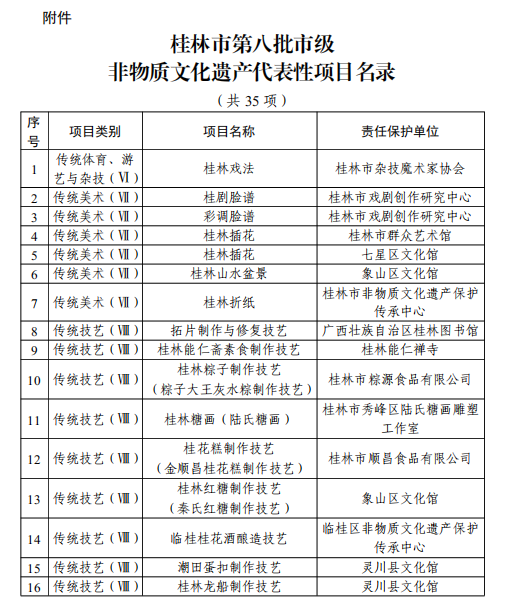 经广泛动员、推荐申报、专家组评审、公开公示等程序,桂林市人民政府于2024年11月13日正式公布,同意将“桂林戏法”等35个项目列入桂林市第八批市级非物质文化遗产代表性项目名录。