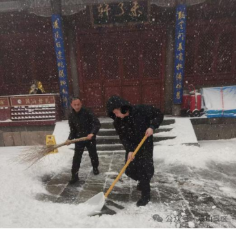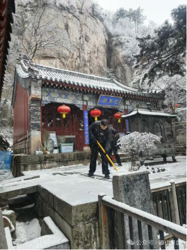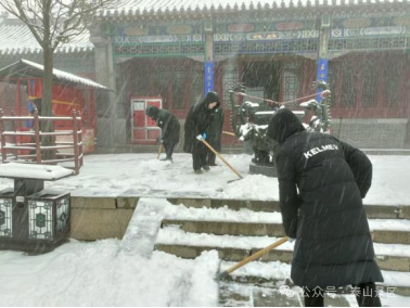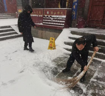 对各经营区域、部分登山盘道开展扫雪除冰工作,员工利用推雪铲、铁锹、扫帚等工具,默契配合,分工明确,南天门经营区全体员工克服严寒天气和身体劳累,经过4个多小时奋战,将景区经营区域和部分道路积雪清理完毕,员工用实际行动诠释了责任与担当,成为雪景中一道靓丽的风景线。