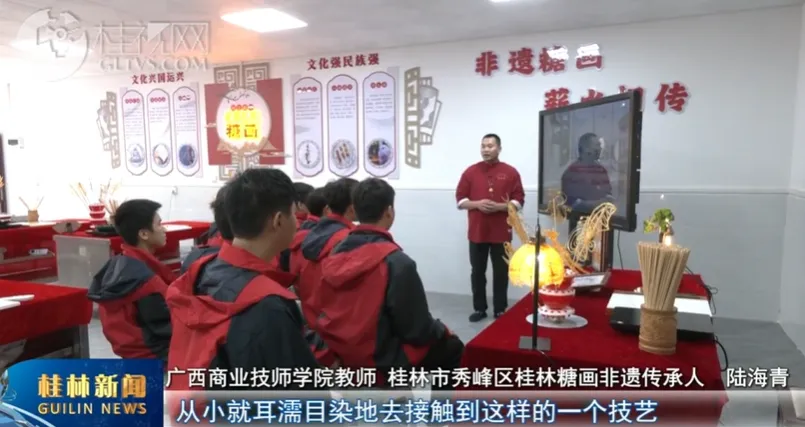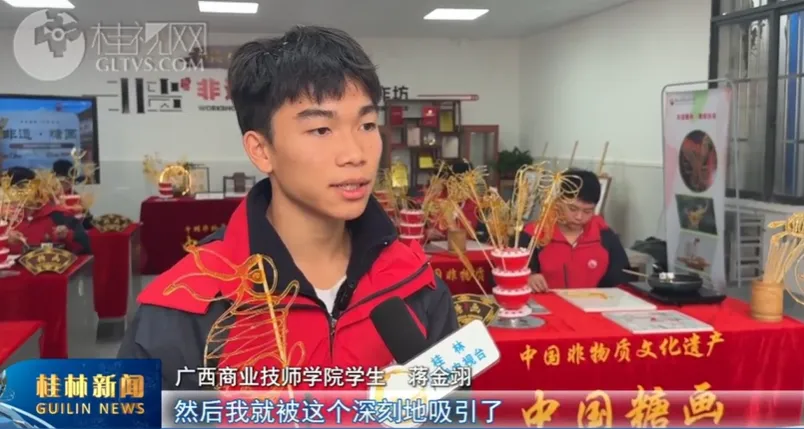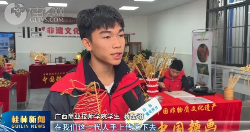 在许多人心中,糖画是一份藏在童年记忆里的甜蜜回忆。而对时下一些青少年来说,糖画却只是在网上流传的民间技艺。作为桂林糖画传承人,陆海青一直坚持“保护为主、抢救第一、合理利用、传承发展”的原则,积极参与各类非遗展示活动,让更多新时代的孩子近距离感受糖画的魅力。同时,在自己工作的广西商业技师学院开设糖画课程,创办非遗糖画协会,加强非遗保护、普及、宣传工作,也得到了学校的大力支持。今年15岁的蒋金翊刚入校就被糖画社团吸引。