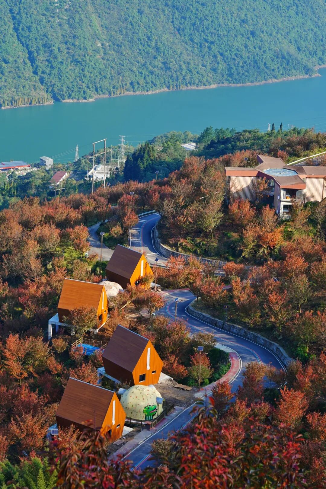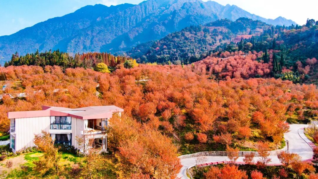 这里的秋日惊艳至极,房前的樱花树换上红色盛装,与远处山谷的彩林连成一片天然油画,每个角度都适合放在取景框里。