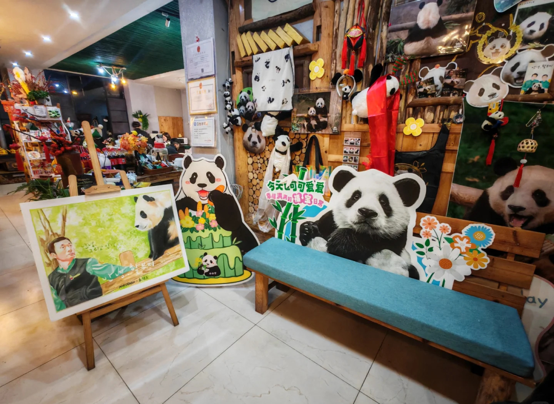 民宿里还有熊猫文创,精美的冰箱贴、可爱的熊猫立牌、时尚的熊猫包包、憨态可掬的玩偶……熊猫控恨不得立刻全套打包。