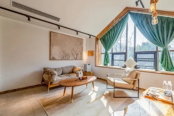 民宿房间风格雅致,原木系家具搭配落地窗,简约而不失格调,阳光透过窗户洒在房间里,营造出一种温馨而舒适的氛围。