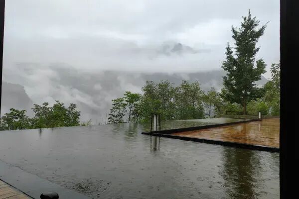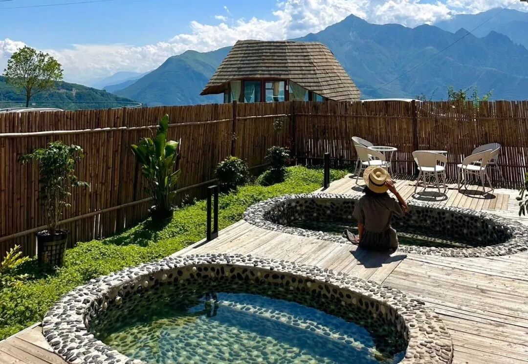 私汤池就嵌在每间房的露台上,泡在汤池中,抬头是连绵的青山,低头是云雾在山谷里“遛弯”,那种感觉简直太奇妙了。