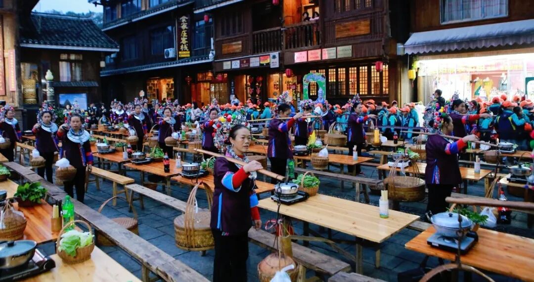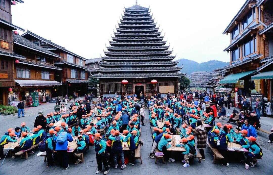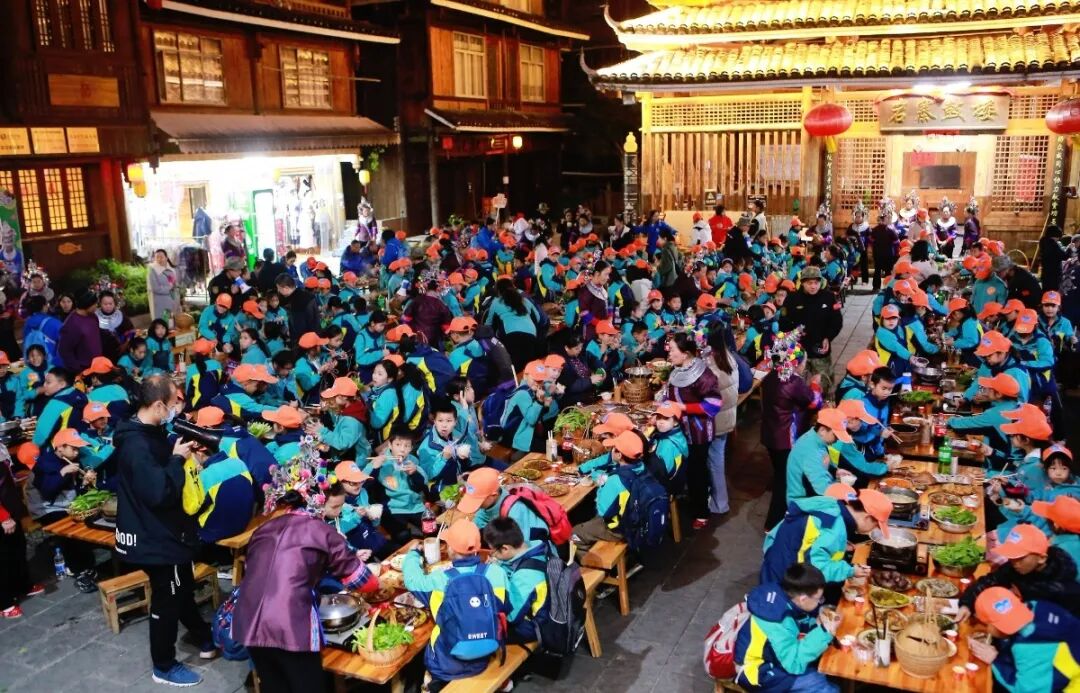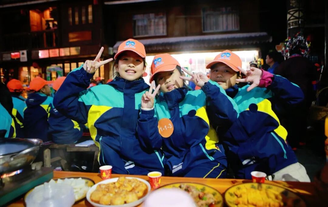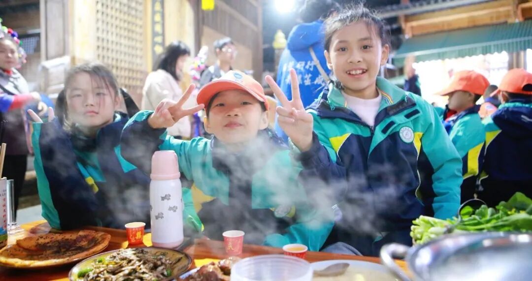 夜幕降临,灯火辉煌的程阳八寨更是别具风情。同学们围坐一起,品尝侗族特色美食——百家宴。美食的香气与欢快的笑声交织在一起,构成了一幅和谐美好的画面。