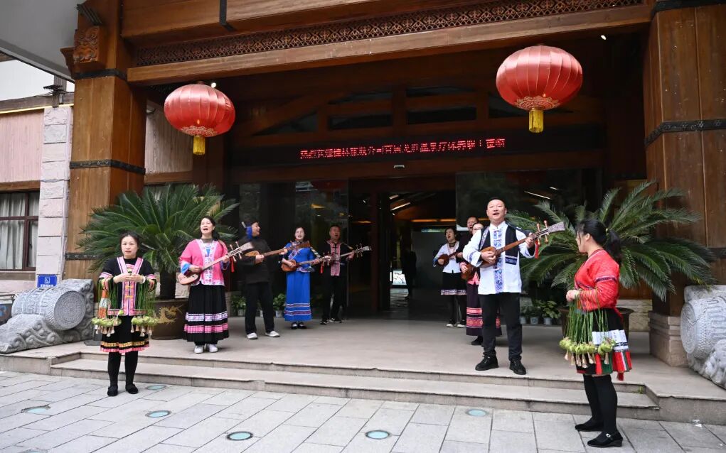 活动的第一天,职工们抵达龙胜中心温泉酒店时,龙胜温泉的同事们以一场热烈的少数民族琵琶山歌迎宾仪式欢迎来自股份公司旗下企业的职工们,他们身着传统服饰,手持琵琶,唱响富有民族特色的山歌,歌声悠扬动听,气氛温馨而热烈。