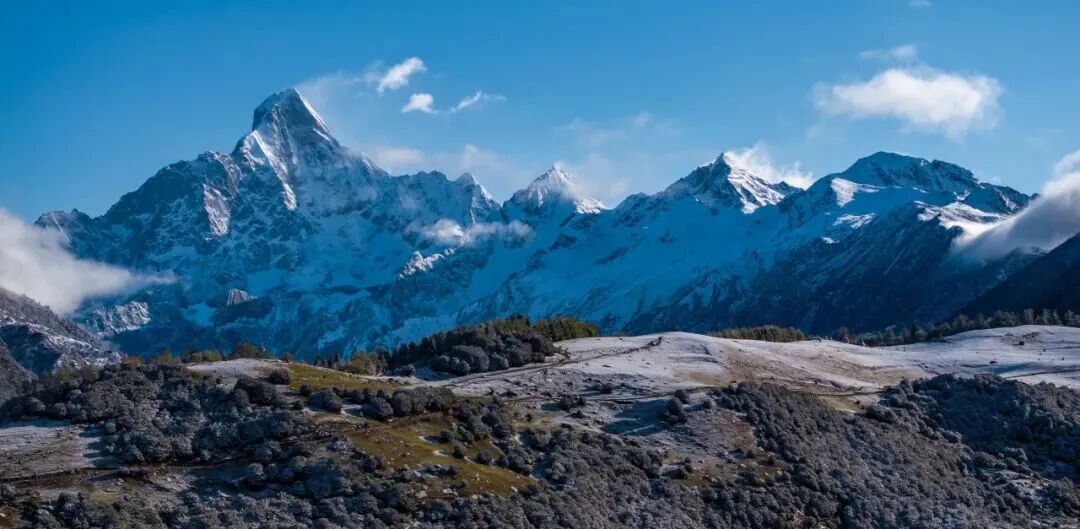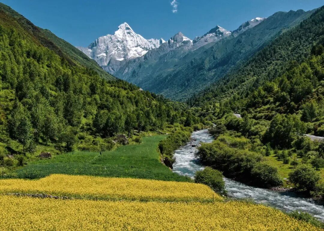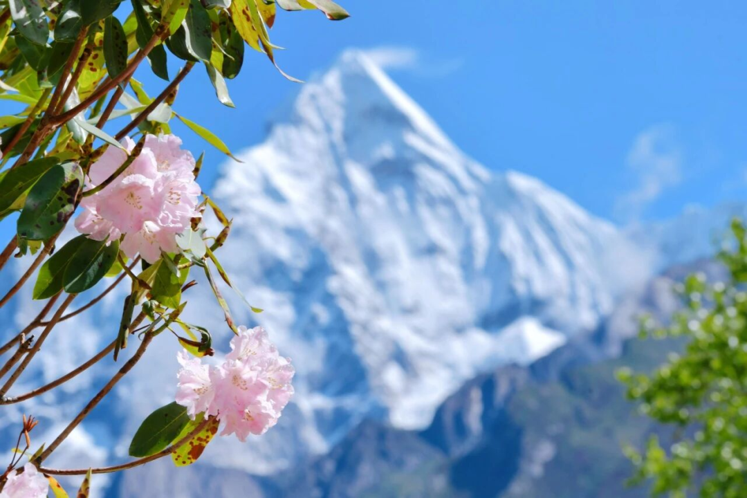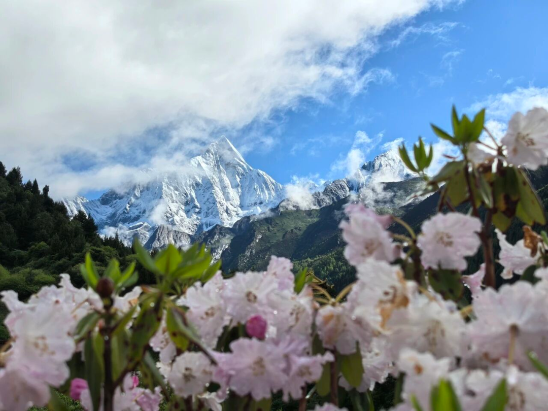 当城市开始闷热,这里的风还带着雪山的清凉,海拔6250米的幺妹峰依旧银装素裹,山腰的杜鹃已含苞待放。