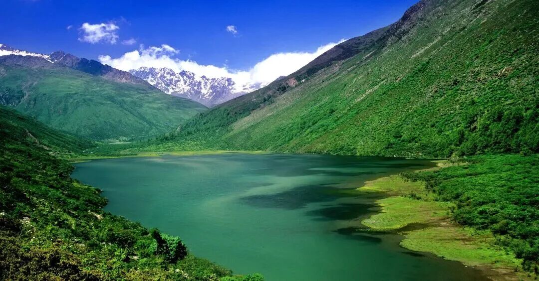 高山湖泊也开始解冻,澄澈的湖水倒映着雪山,像散落的宝石,散落在山谷之间。