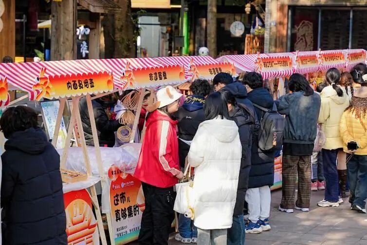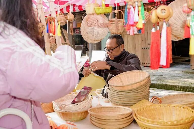 在古镇景区市井印象广场,非遗市集汇集了数十家非遗文创优质品牌和业界大咖,展出了上千件特色文创产品和非遗产品。内画鼻烟壶、传统手工粗布、崇州道明镇开文竹编、“古镇黄龙溪”烧椒酱、大良非遗陶塑、德阳染云山房、滨滨香水香薰、成都糖画、田氏风车、非遗蜀锦蜀绣、芙蓉门非遗文创、川江竹艺等吸引了大量“粉丝”,非遗传承人亲自上阵,带领游客体验非遗制作的独特魅力。这些展品和体验项目不仅吸引了大量游客驻足观赏和体验,还进一步推动了黄龙溪古镇非遗文化的传承与发展。