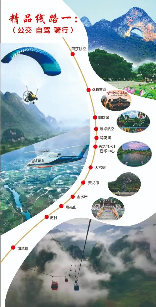 为全面推进《“十四五”通用航空发展专项规划》和《桂林世界级旅游城市建设发展规划》,桂林市依托区内丰富旅游资源,以满足多样化新兴消费需求为目标,在阳朔遇龙河景区大力扶持“通航+旅游”“通航+运动”产业。阳朔以“通航+”为切入点,以多要素耦合、多产业融合为抓手,明确发展定位和特色,采取多种措施,开发大众化、经济型的“低空+旅游”产品,完善“吃、住、行、购、娱、休、养、学”全链条服务,科学构建新颖、蓬勃的低空经济产业体系,积极打造航空IP效应,推出热气球、滑翔伞、直升机等低空游览产品,并推动低空观光游、主题游、体验游等多形态旅游发展,积极打造“中国最佳低空旅游目的地”。