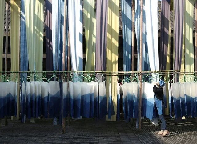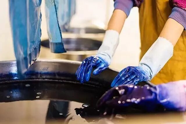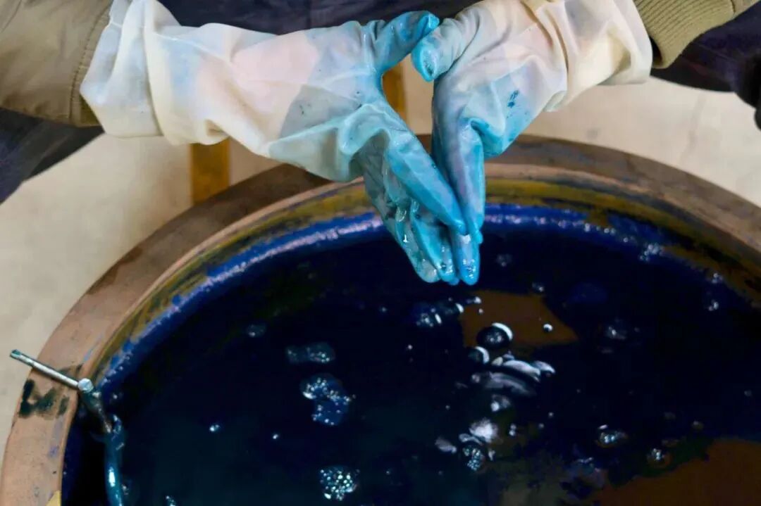 放进染缸时不能急,要让布完全浸在靛蓝里,等上半刻钟再轻轻提起,看着素布从浅灰慢慢变深,在空气里经历一场温柔的氧化。不过十几分钟,原本的淡蓝就会透出沉静的靛色,风一吹,布面上还会泛着细碎的光泽。