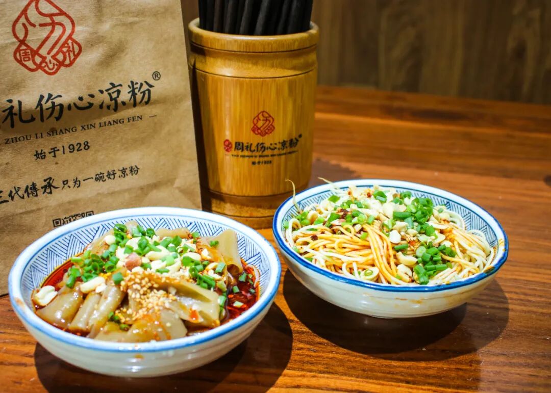 始于1928,周礼伤心凉粉是一家资格老店,不仅是“资阳市非物质文化遗产”,还被评为“四川名小吃”“资阳特色名小吃”等。有米卷、凉粉、凉面可以选择,主打一个辣,即使辣得泪流满面,也要再来一碗!他家还可以真空,吃完顺便打包带给朋友~
