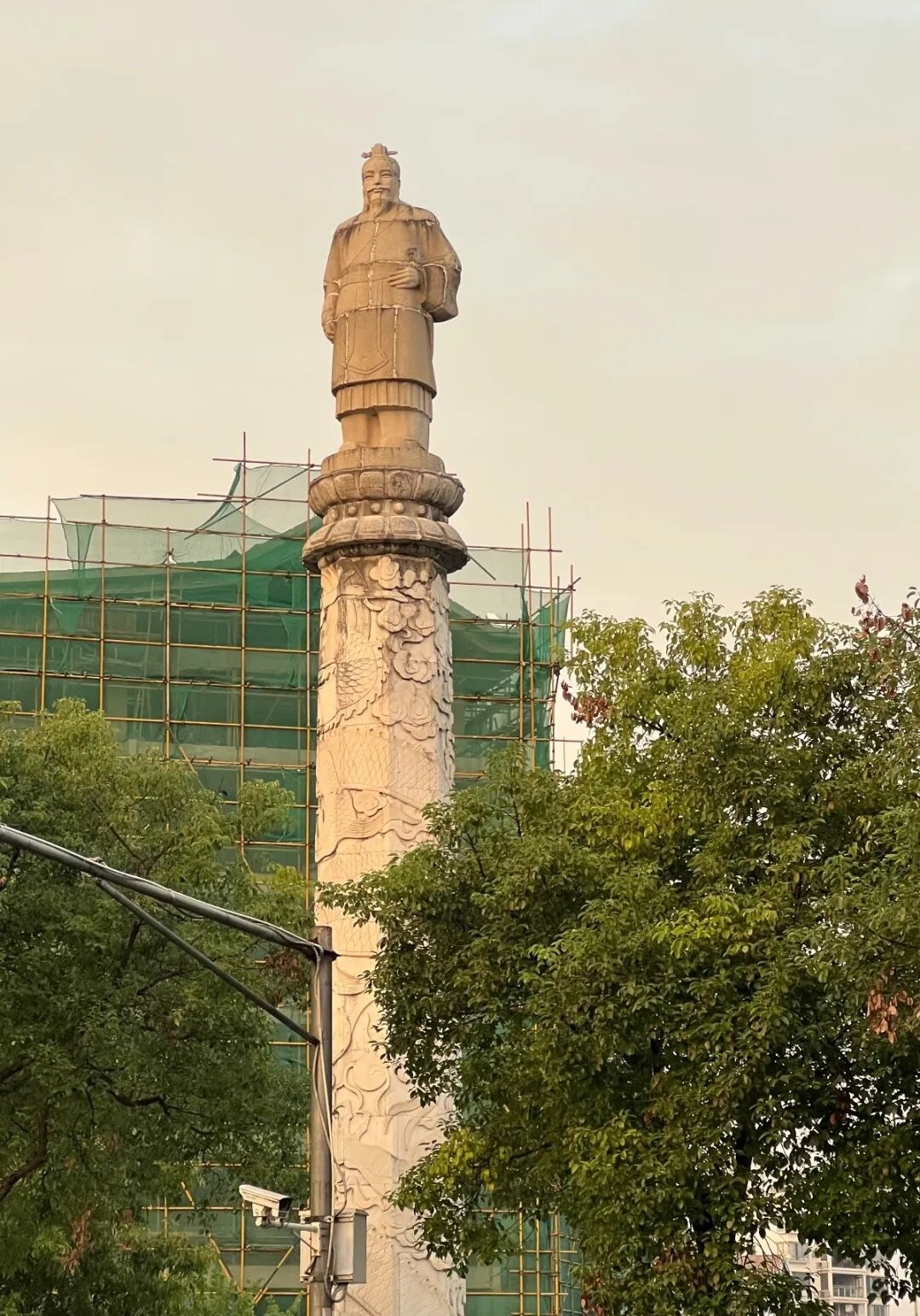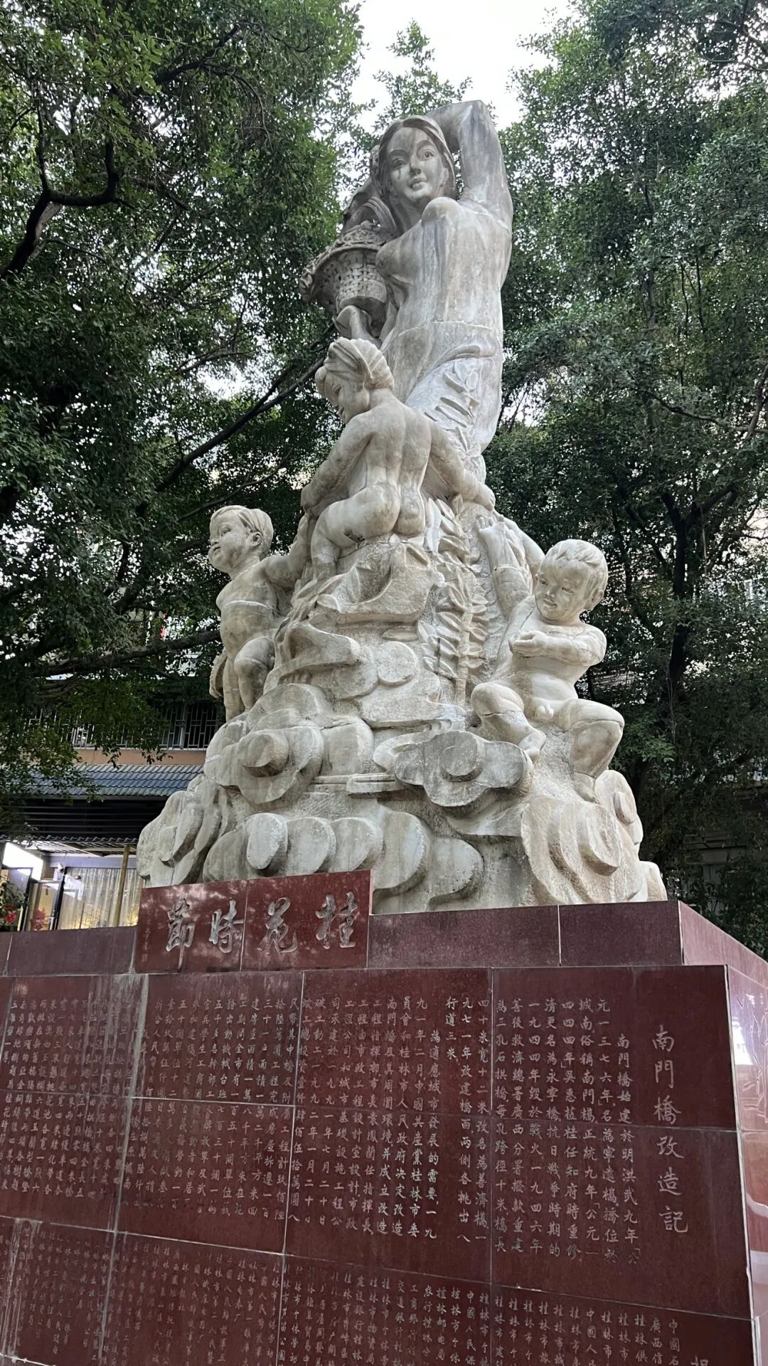 在南门桥头,也有一个创作于上世纪90年代的雕塑,这个雕塑主体底部是一簇祥云和交错的花枝,一个女子手举花篮,几个孩童围绕其玩耍,充满了活力与生命力,该雕塑的底座上刻有雕塑的名称——《桂花时节》,还有一篇南门桥改造记,另一面刻有该雕塑的建造信息。