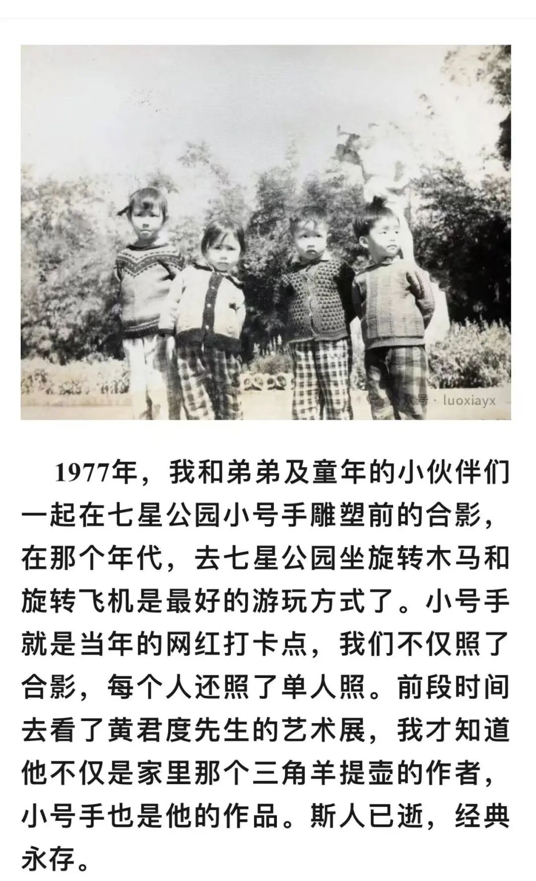 前段时间,一位市民在网络上分享了自己的一张老照片,是1977年他和他的弟弟以及童年的小伙伴在《红军小号手》雕塑前的合影,他说,在那个年代,小号手的雕塑就是当年的网红打卡点,当时他们不仅在小号手前照了合影,而且每个人还照了单人照。最近,他去看了黄君度的艺术展,才得知,原来小号手就是黄君度的作品。他也不禁感叹:斯人已逝,经典永存。