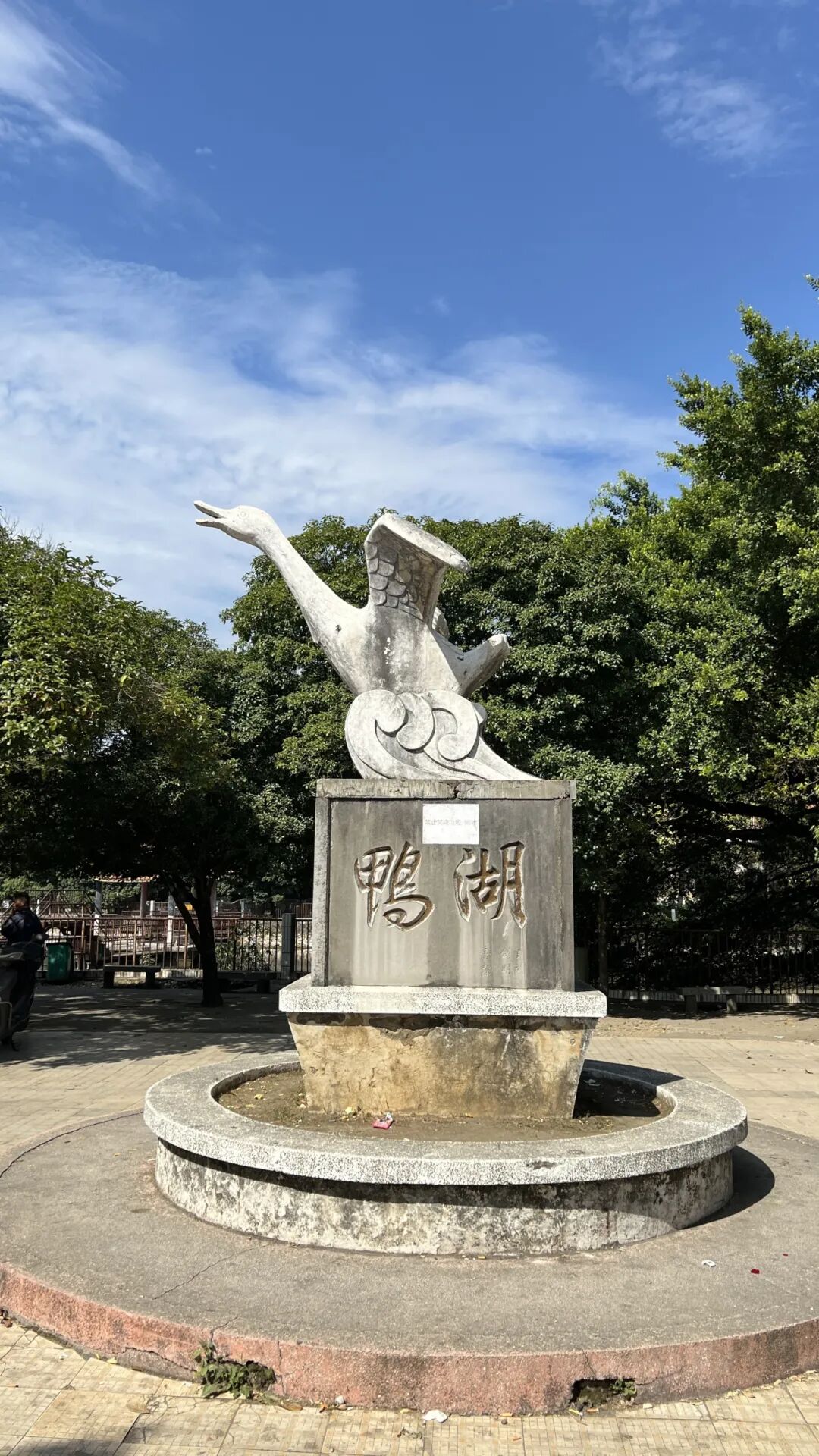 在叠彩区水塔路附近的鸭湖公园入口处,有一个1991年工艺美术研究所创作的雕塑,其主体是一只踏在浪上呈飞翔状的鸭子,雕塑下方刻有“鸭湖”二字,另一侧还刻有雕塑创作时间及捐款人名单。在鸭湖公园内闲坐的徐大爷说,他就是住在附近的老铁路人,雕塑下方记录的名单就是以前一同捐款建设公园的铁路人。