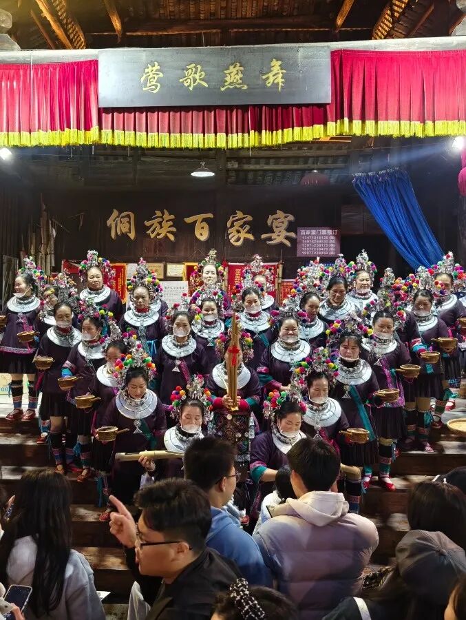 除了非遗技艺的学习,学生们还体验了侗族的传统美食——百家宴。地道的侗族菜肴、侗族人民的热情好客、古老村落的淳朴民风,在程阳八寨的宴席上展现得淋漓尽致。