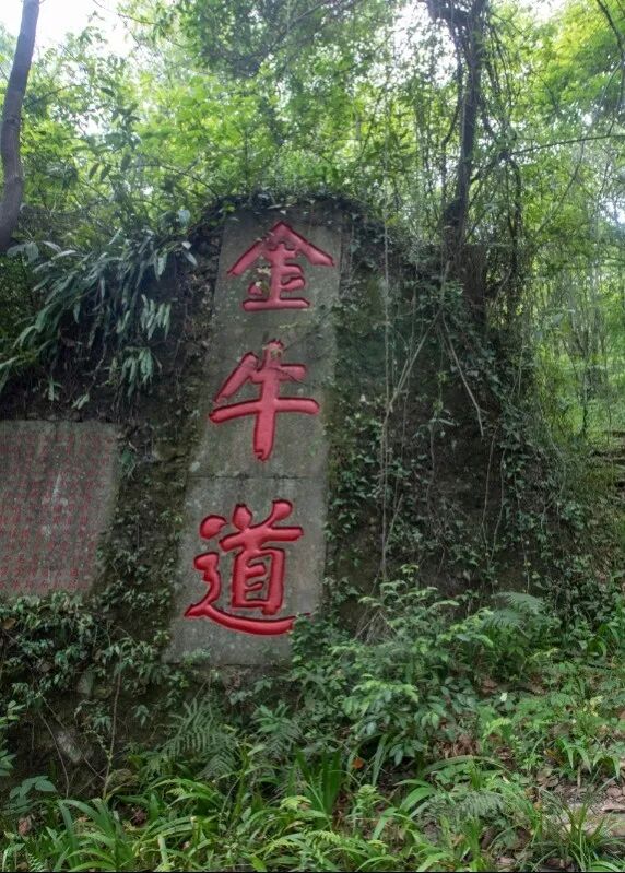 相传秦惠文王时期,古蜀王为获取秦王赠予的金牛,派遣五位大力士带领数千人凿山开路,开辟出这条金牛道。五位壮士在途径大剑山时发现一条巨蛇,五人合力去拔,结果把山拉垮了,从而剑门关的断岩绝壁中,出现了一条由秦地通往蜀地的道路。这也是李白《蜀道难》里“地崩山摧壮士死,然后天梯石栈相勾连”的典故。