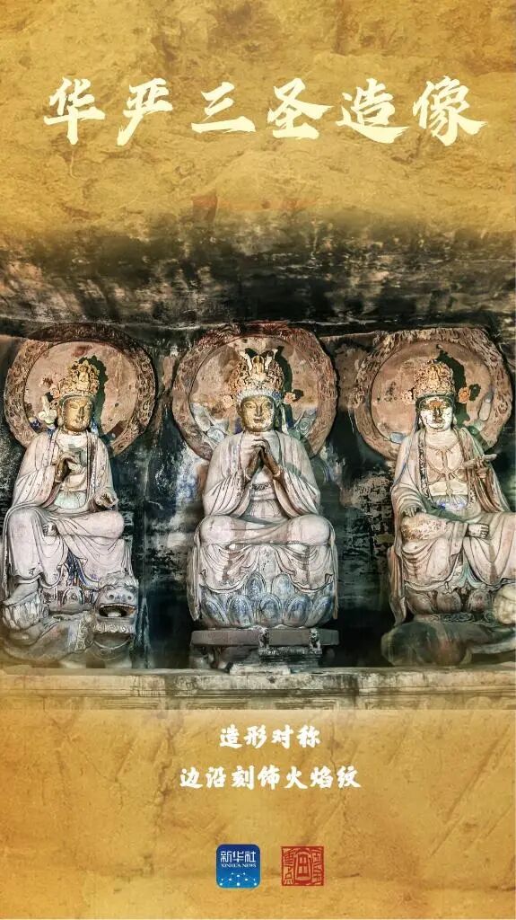 华严洞造像始造于宋代,拥有华严洞和大般若洞两大洞窟,内有宋代造像159尊、历代碑刻题记24处,因内刻主尊“华严三圣”而得名。其布局严谨、造型奇妙、动静结合、虚实得体、采光科学,石窟殿堂富丽辉煌,人物刻画精美绝伦,是目前中国雕刻艺术最精湛、保存最完好的宋代石窟之一。“华严三圣”三尊佛像高为5.2米,中为毗卢遮那佛,左右分别为普贤菩萨与文殊菩萨,结跏趺坐于白象、青狮背上。左右侧壁各刻有通高4.1米的菩萨各五身,壁上方刻有善财童子五十三参图,壁前端各刻有一只下山吼。全窟构思巧妙、布局严谨、动静结合,堪称石刻艺术精品。造像无言,岁月有痕