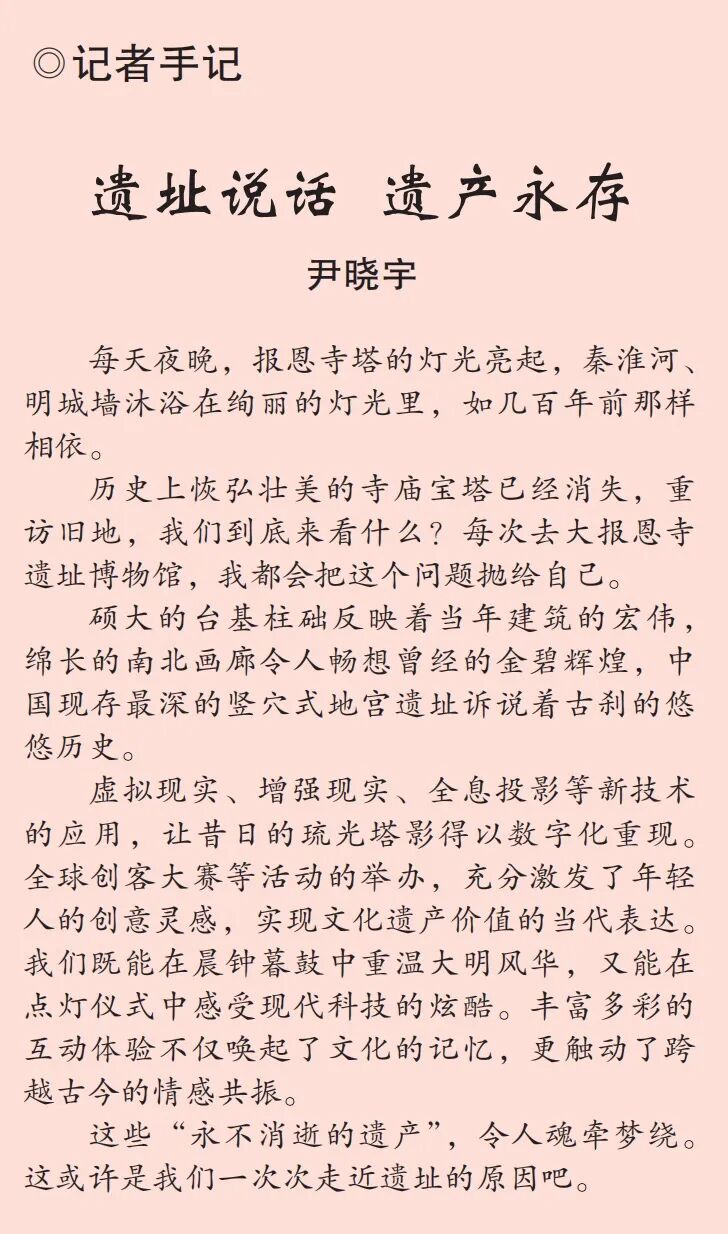 2015年,大报恩寺遗址博物馆建成开放,近年来,成为备受市民游客喜爱的南京文化地标之一。“用遗址公园讲好南京故事,打造大报恩寺塔文化符号,不仅是对历史的致敬,更是对文化传承的创新探索。”大报恩寺遗址博物馆馆长王文溪说。日间逛馆、夜晚点灯,游客在这里触摸历史、感受文化,古老的遗址焕发出新的生命力。