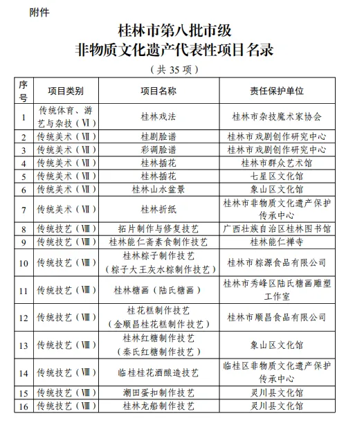 经广泛动员、推荐申报、专家组评审、公开公示等程序,桂林市人民政府于2024年11月13日正式公布,同意将“桂林戏法”等35个项目列入桂林市第八批市级非物质文化遗产代表性项目名录。