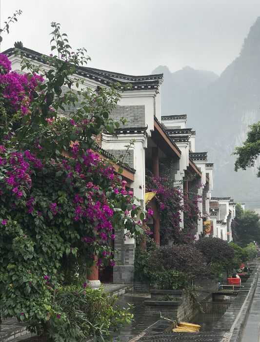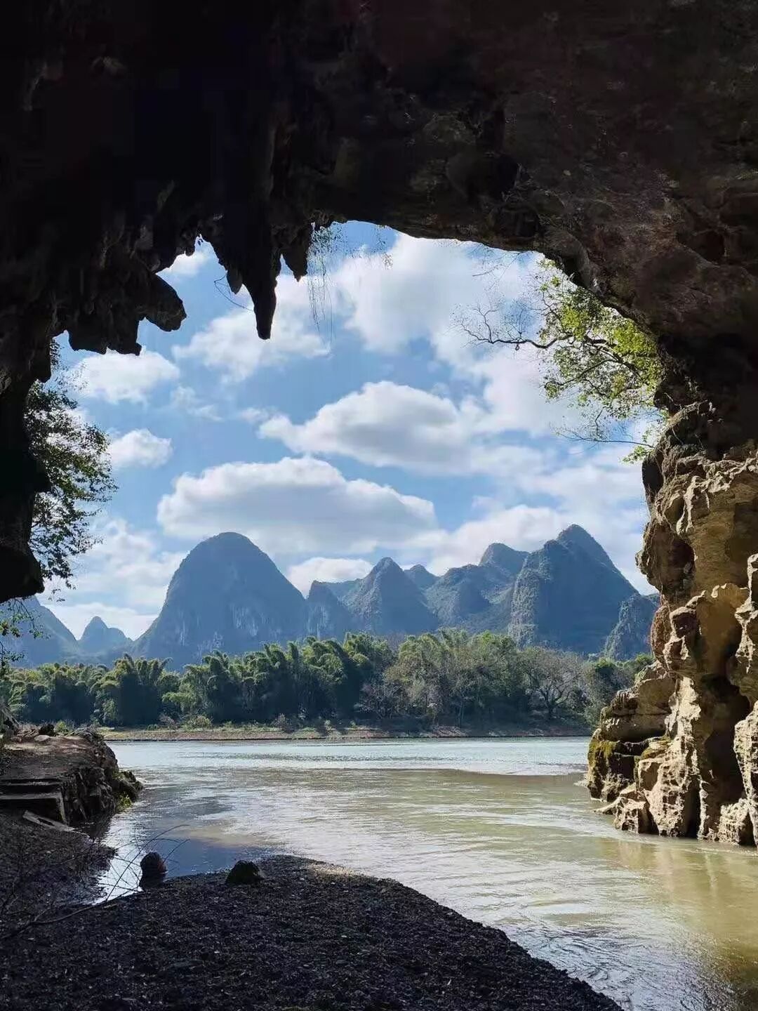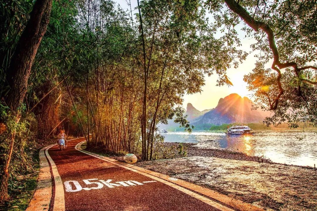 草坪还有一条彩色沥青铺面通往冠岩景区与漓江相依相偎的骑行景观漓江绿道。当你走进雨后的绿道,扑面而来是一丝丝淡淡的清香,好像闻到竹叶的茶香,令人神清气爽;走进晴天的绿道,阳光从竹林的缝隙透射到落叶上,好像洒了一地的碎银;绿道中竹枝半遮半搭,好像一座迎宾的拱门,迎接八方宾客,领阅漓江沿岸风光,感受一种远离城市的心旷神怡……