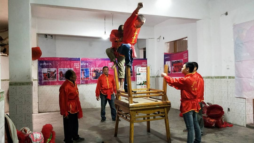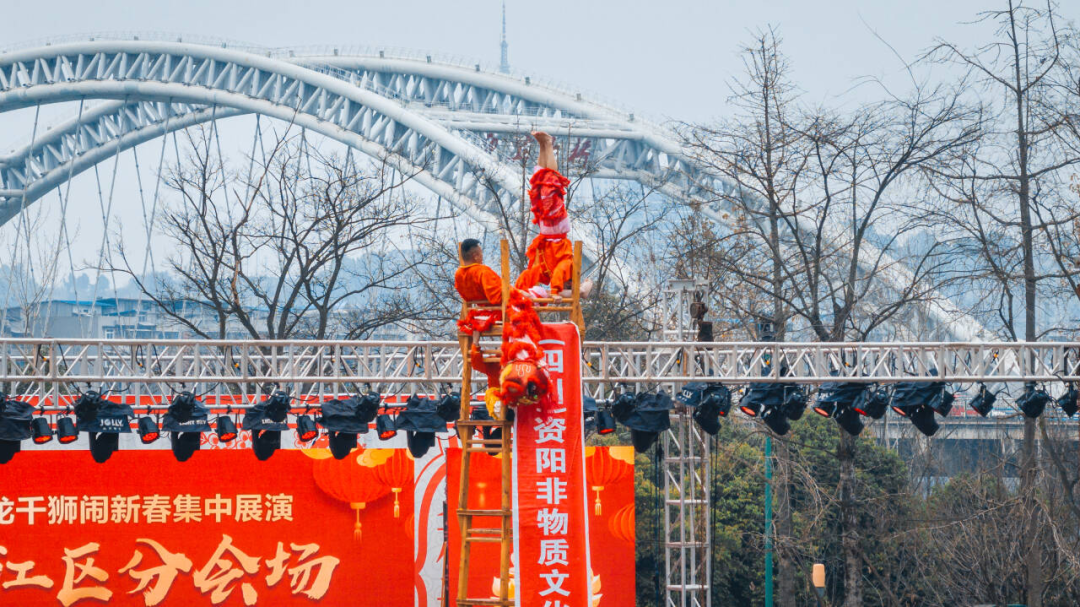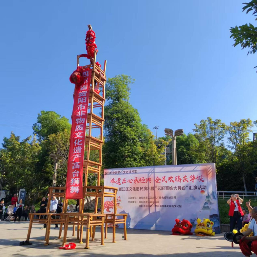 这项始于明代成化年间的技艺,跨越500余年时光,被誉为“川中民间技艺明珠”。其表演分地狮、平台、五台、十二高台四类,以“十二高台”为特色 ——用十二张方桌层层搭建舞台,艺人在不足 0.6 平方米的顶层,不设任何保险完成高空鹏展、金鸡独立、海底捞月等高难度动作,尽显“高、险、奇、难”的独特魅力。