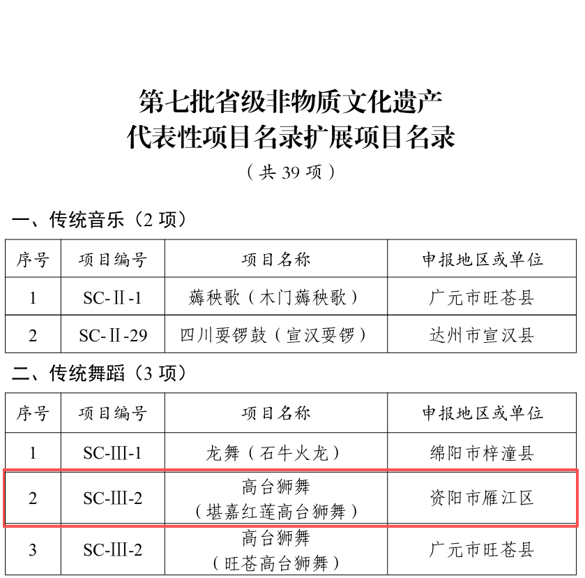 12月25日,四川省第七批省级非物质文化遗产代表性项目名录公布,雁江区堪嘉红莲高台狮舞荣耀上榜。