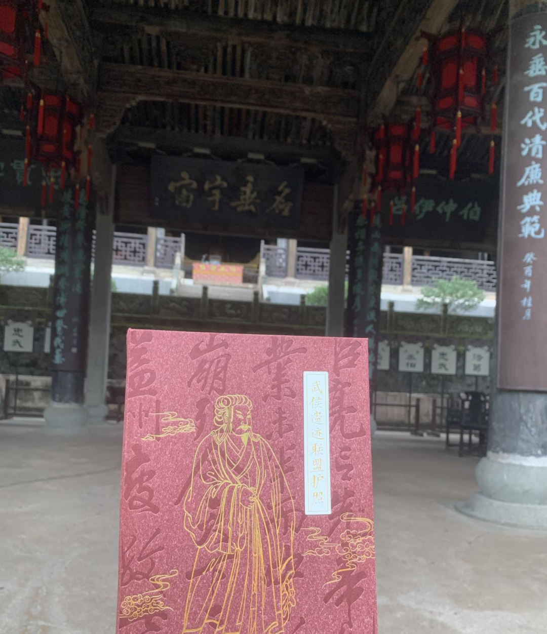 “武侯遗迹联盟护照”朱红色封面上烫金诸葛亮画像,古色古香,底纹《出师表》内容若隐若现。在“护照”中,我们可以了解全国多处的武侯遗迹,穿越时空长河,与诸葛先生对话交流。