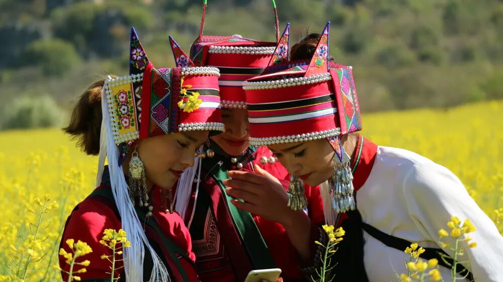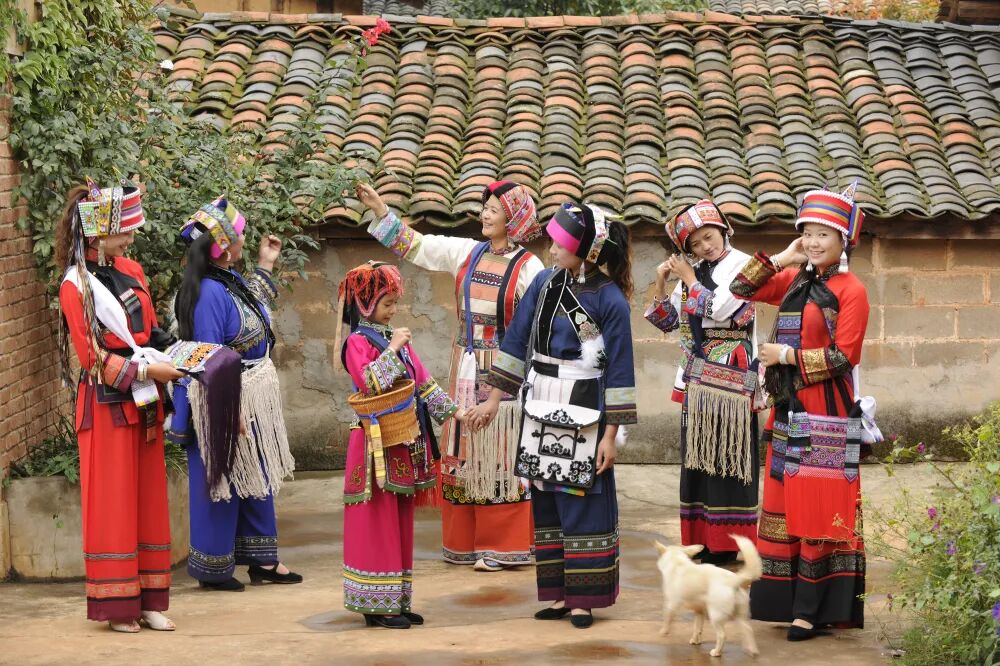 撒尼人出门赶集或访友时,配挂自己缝制的麻布花包。女式花包两侧饰毛线絮带和银铃。走动时,银铃絮带颤动,发出叮当响声。