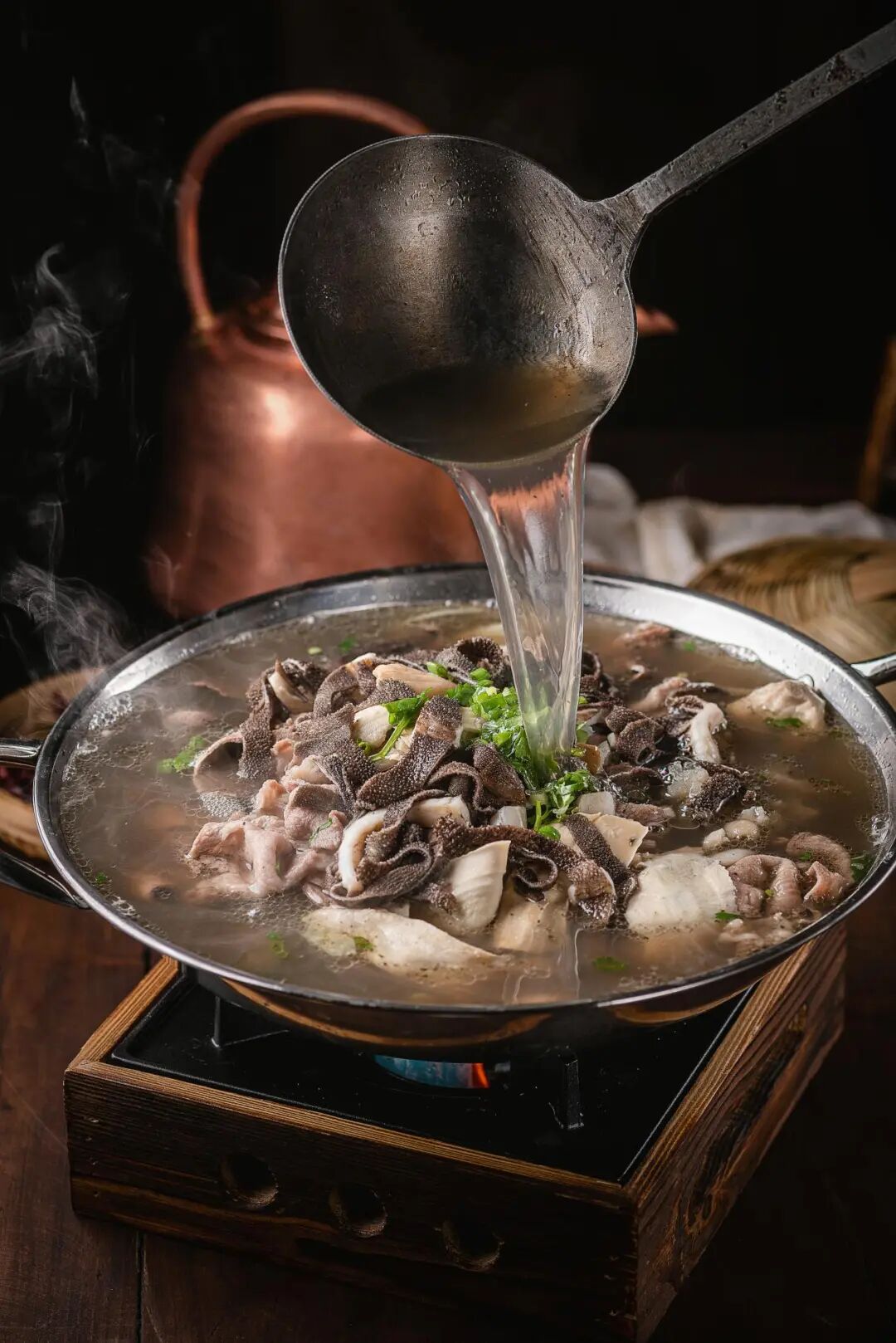冒沸腾热气的跷脚牛肉
