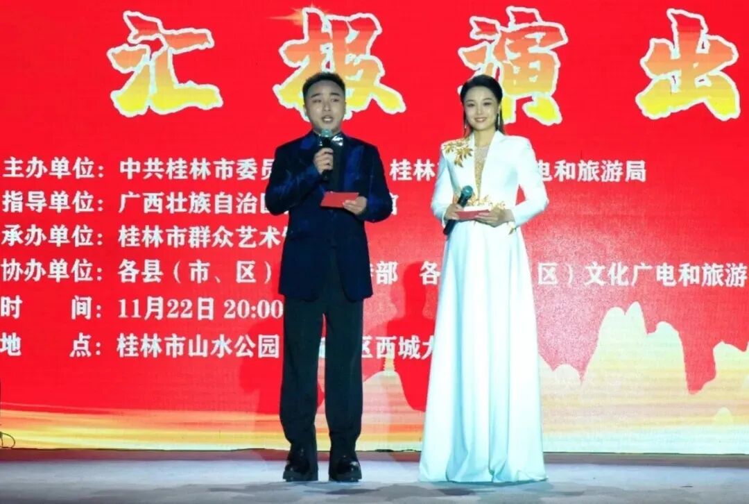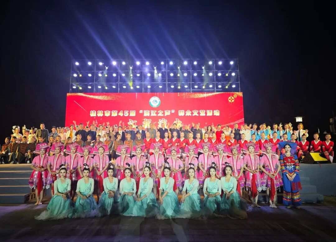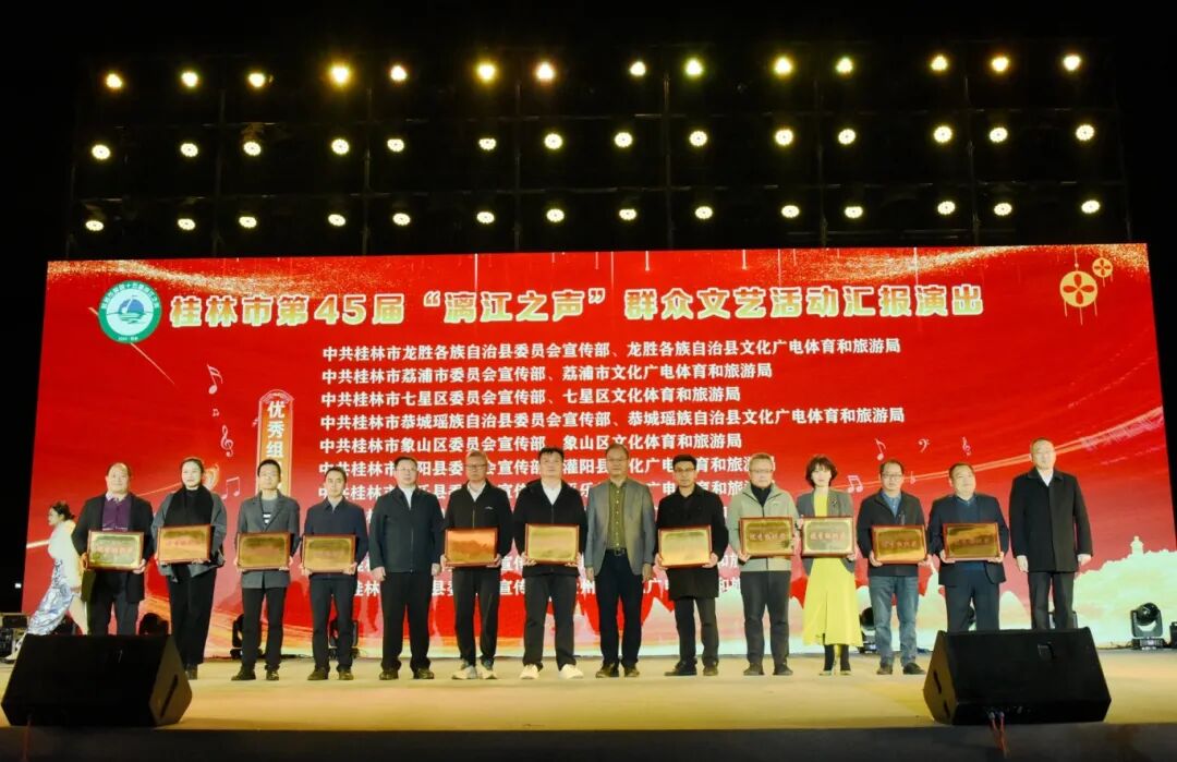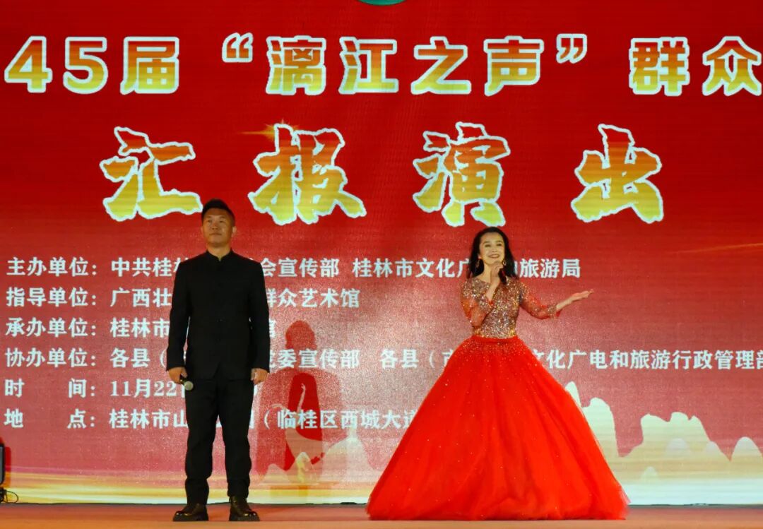 11 月 22 日 20:00,桂林市第 45 届“漓江之声”群众文艺活动汇报演出在桂林市山水公园隆重举行。本次活动由中共桂林市委员会宣传部、桂林市文化广电和旅游局主办,广西群众艺术馆指导,桂林市群众艺术馆承办,各县(市、区)党委宣传部、文化广电和旅游行政管理部门等协办。