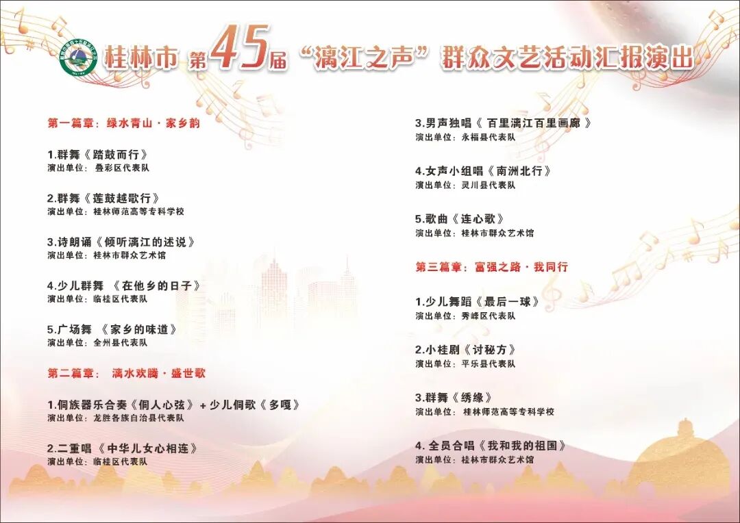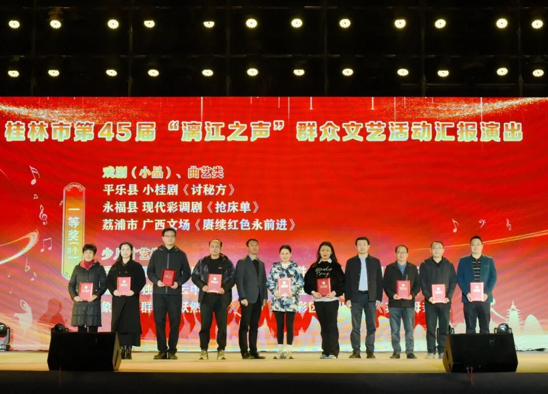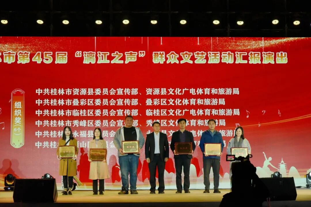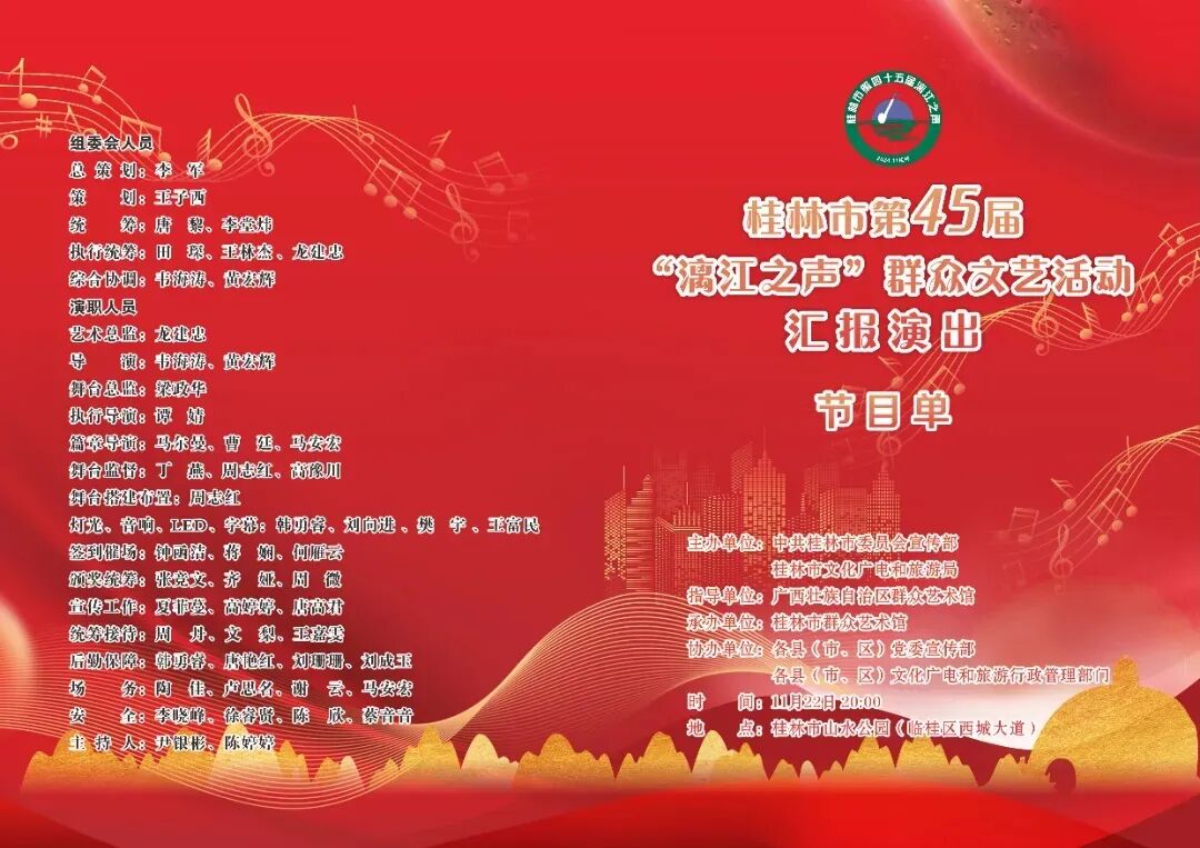 11 月 22 日 20:00,桂林市第 45 届“漓江之声”群众文艺活动汇报演出在桂林市山水公园隆重举行。本次活动由中共桂林市委员会宣传部、桂林市文化广电和旅游局主办,广西群众艺术馆指导,桂林市群众艺术馆承办,各县(市、区)党委宣传部、文化广电和旅游行政管理部门等协办。