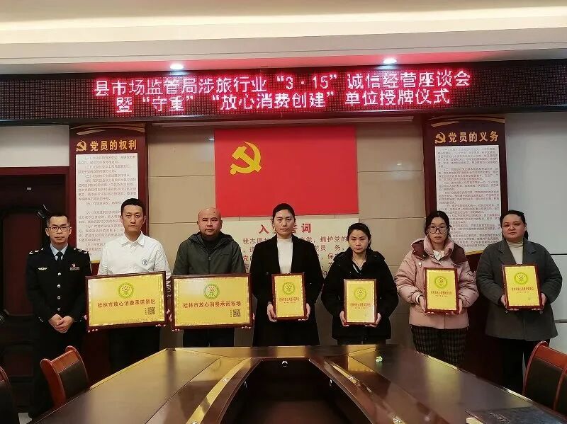 近日,在阳朔县市场监管局组织召开的“3·15”诚信经营企业座谈会上,桂林阳朔山水旅游开发有限公司凭借卓越的表现,斩获“守合同重信用”单位和“放心消费创建单位”两项殊荣,并在会上接受了授牌。