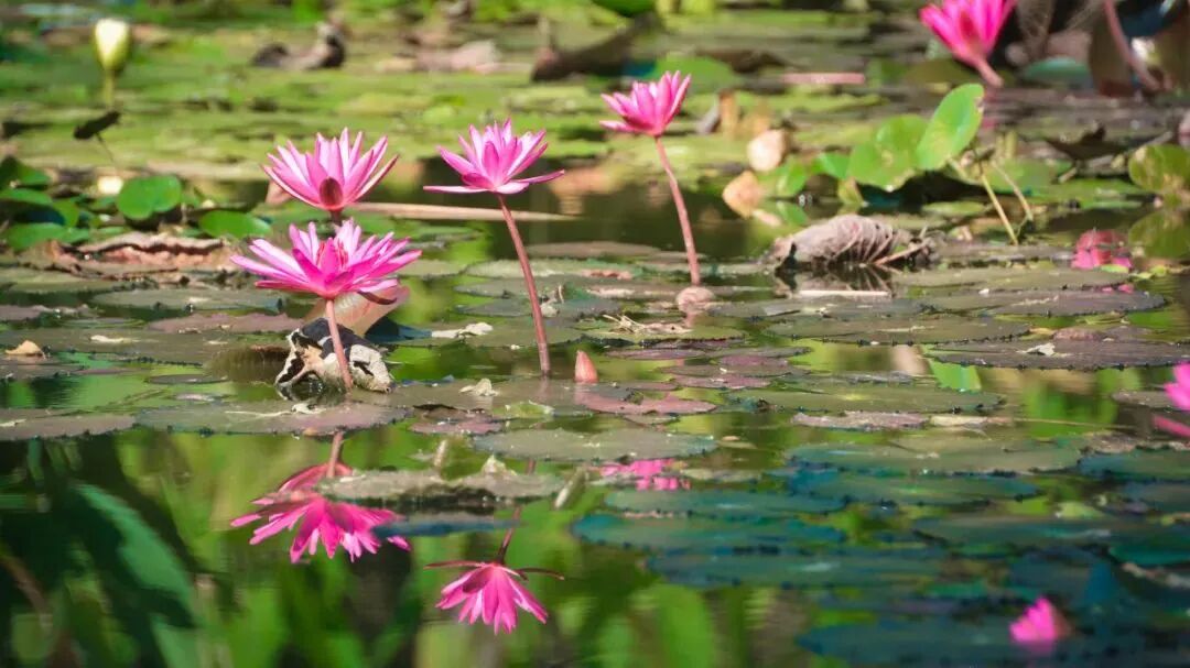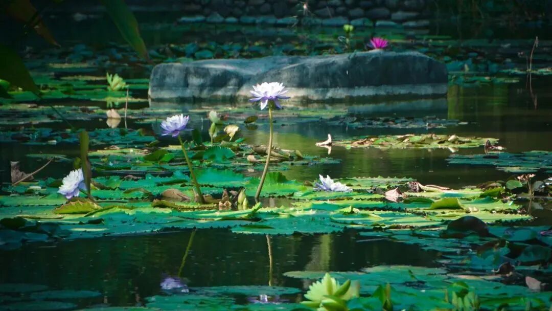睡莲依然亭亭玉立倒影水面