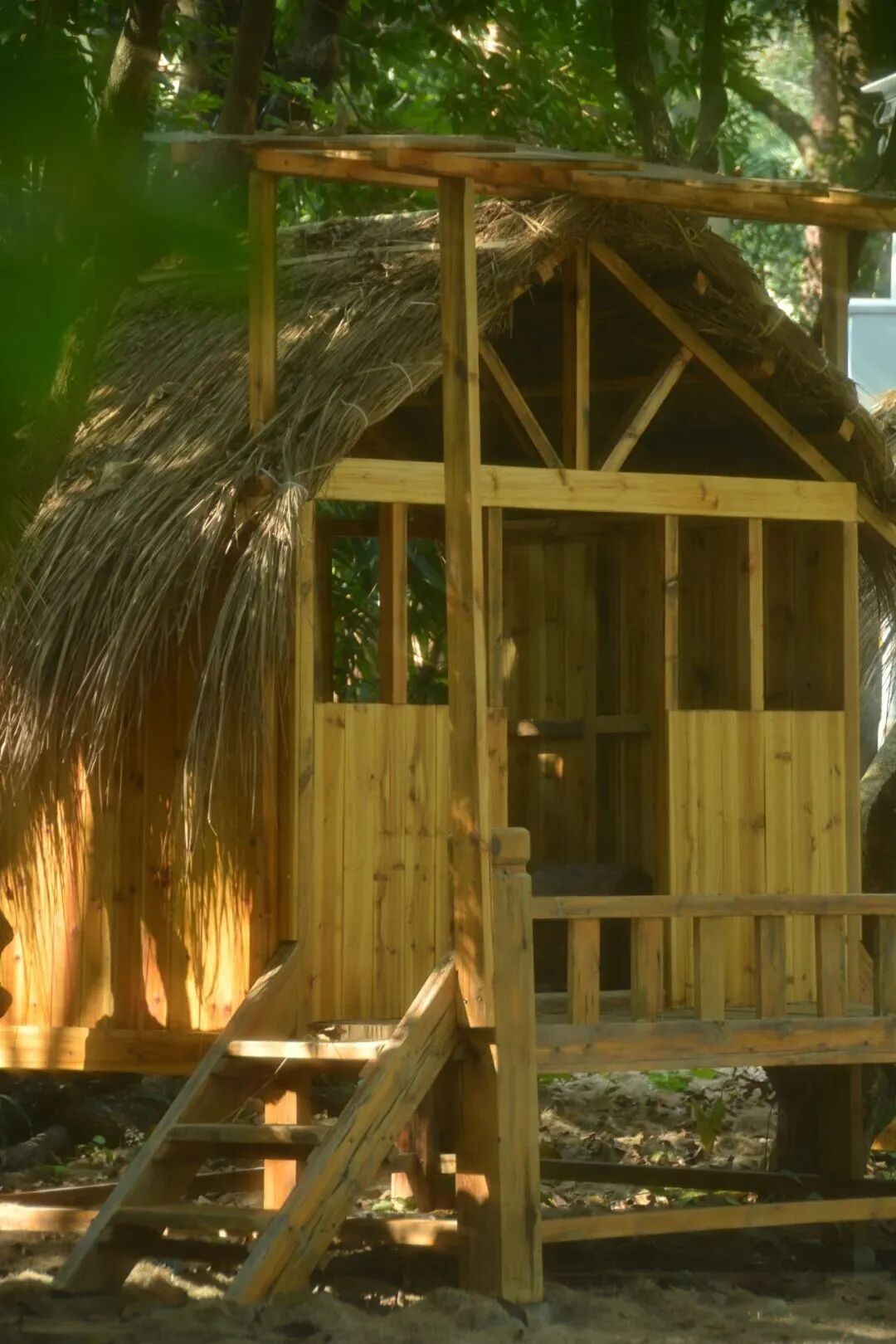 阳光穿透层层树林洒在小木屋