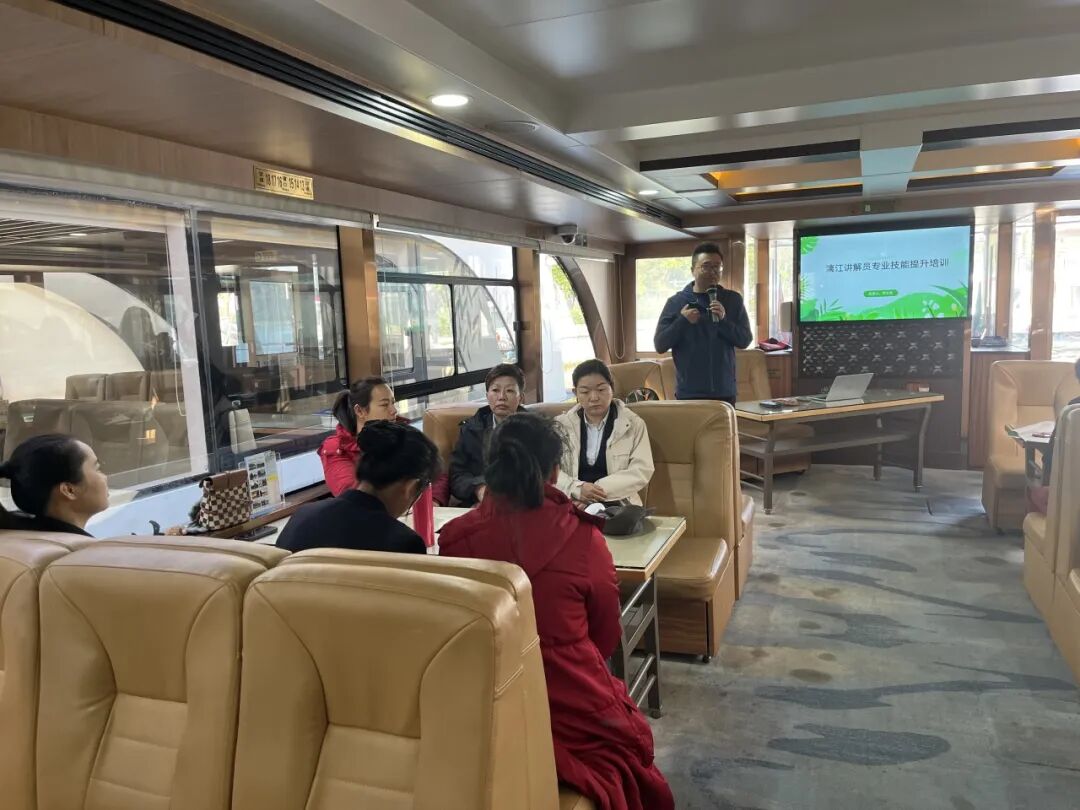 11月14日,漓江市内游公司联合浩晟公司在三星级游船开展半天导游员培训,6名导游参训。