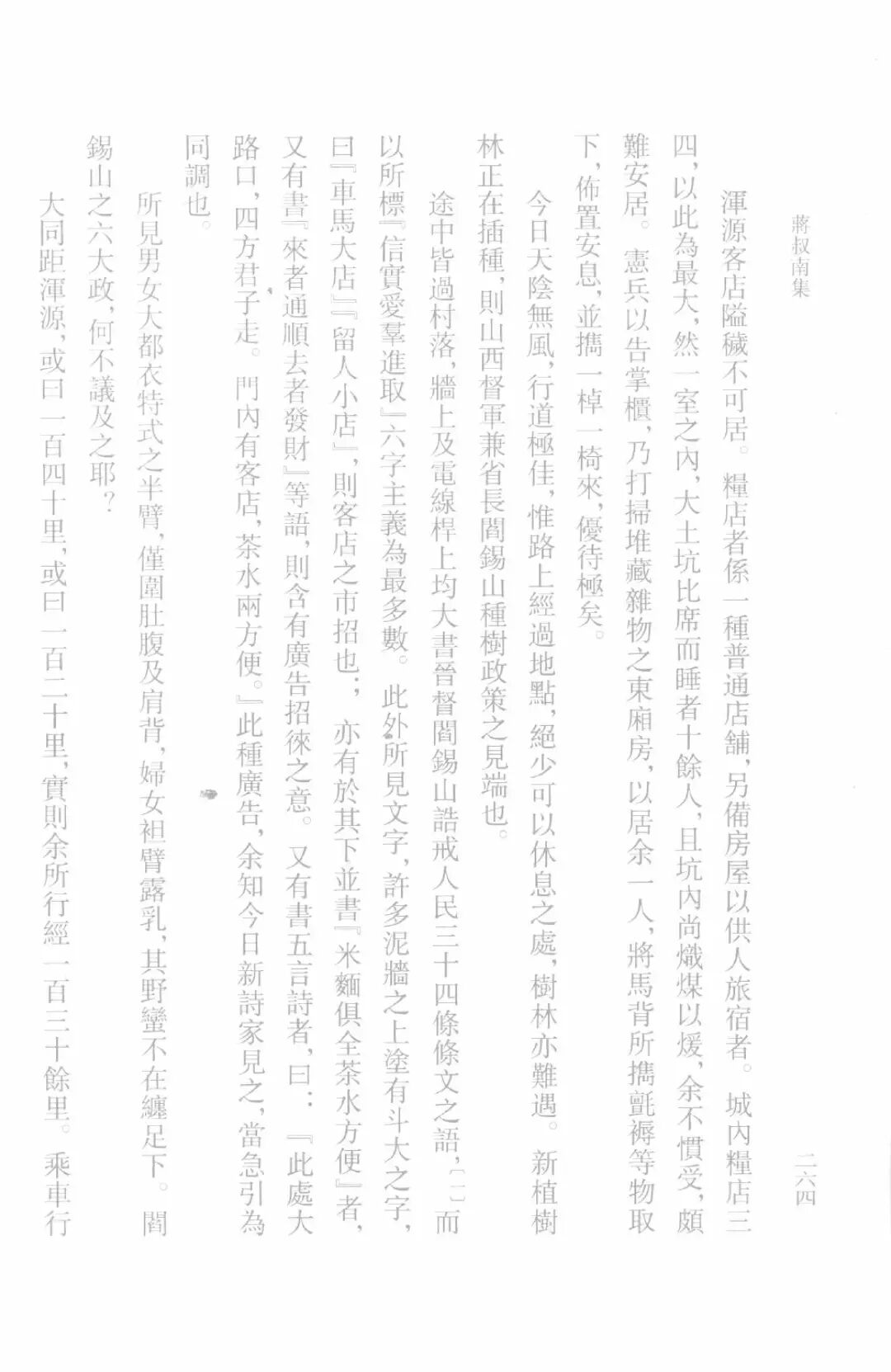 途中皆过村落,墙上及电线杆上均大书晋督阎锡山诰戒人民三十四条条文之语,而以所标“信实、爱群、进取”六字主义为最多数。此外所见文字,许多泥墙之上涂有斗大之字,曰“车马大店”“留人小店”,则客店之市招也;亦有于其下并书“米面俱全,茶水方便”者,又有书“来者通顺,去者发财”等语,则含有广告招徕之意。又有书五言诗者,曰:“此处大路口,四方君子走。门内有客店,茶水两方便。”此种广告。余知今日新诗家见之,当急引为同调也。