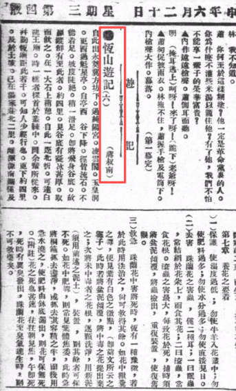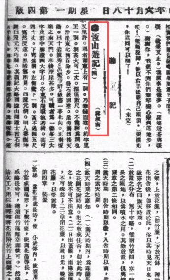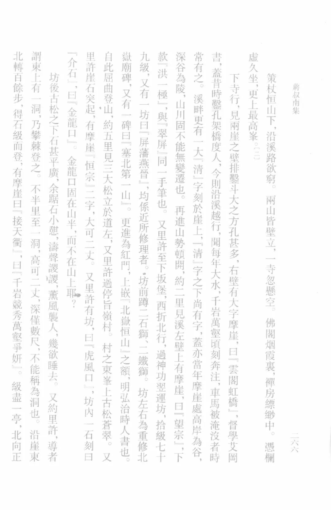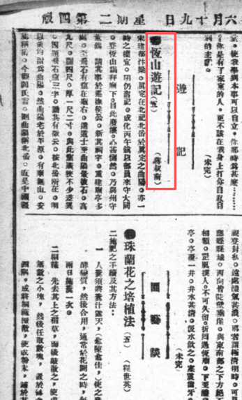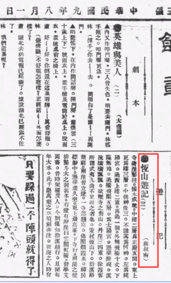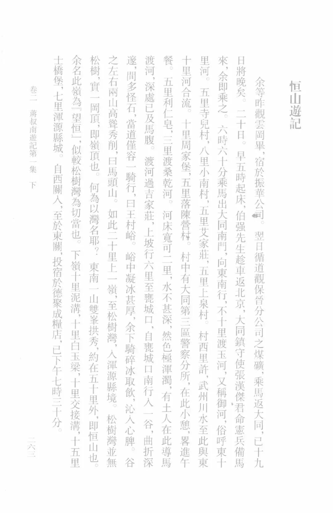 1920年3月17日(农历),蒋叔南与老友梁善济(字伯强,山西省立宪派元老)相偕,由北平出发赴大同,游览武州山云冈石窟造像之胜。20日晨,梁氏返回北平。蒋叔南则策马趋浑源游北岳恒山,历时两日,23日仍由大同返北平。此行写就之《恒山游记》,最初连载于当年《时事新报》第四版,7月30日起,8月4日止,日载一节,分六节载毕。翌年(1921),蒋叔南将包括《恒山游记》在内的多地游记汇编为《蒋叔南游记第一集》一书,梁启超、庄蕴宽作序,由福兴印书局(上海)出版发行。需要指出的是,1921年刊录之《恒山游记》较1920年首发文稿略加修改。