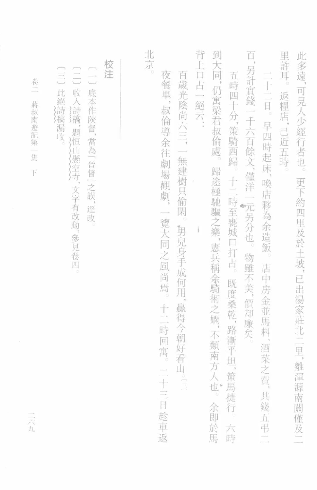 五时四十分,策骑西归。十二时至瓮城口打占。既度桑干,路渐平坦,策马捷行。六时到大同,仍寓梁君叔伦①处。归途极驰驱之乐,宪兵称余骑术之娴,不类南方人也。余即于马背上,口占一绝云: