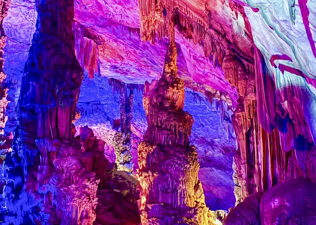 芦笛景区坐落于桂林市西北桃花江畔,是国务院首批国家重点风景名胜区、国家AAAA级景区,更是漓江风景名胜区的核心组成部分。景区以芦笛岩为核心,搭配桃花江、芳莲池的灵秀水景与侯山的青翠山体,山水相依构成一幅绝美的田园画卷,被世界旅游组织盛情推荐,是桂林山水的经典缩影。芦笛岩被誉为“大自然的艺术之宫”,洞内钟乳石千姿百态、栩栩如生。历经千万年的地质演化,石笋、石柱、石幔层层叠叠,在灯光映照下呈现出赤、橙、黄、绿等斑斓色彩,形成“狮岭朝霞”“原始森林”“水晶宫”等经典景观。漫步洞内,钟乳石与地下暗河相映成趣,水滴叮咚如天籁之音,每一处景观都承载着自然的鬼斧神工,更留存着历代文人墨客的赞美题刻,自然奇观与人文底蕴在此完美交融。