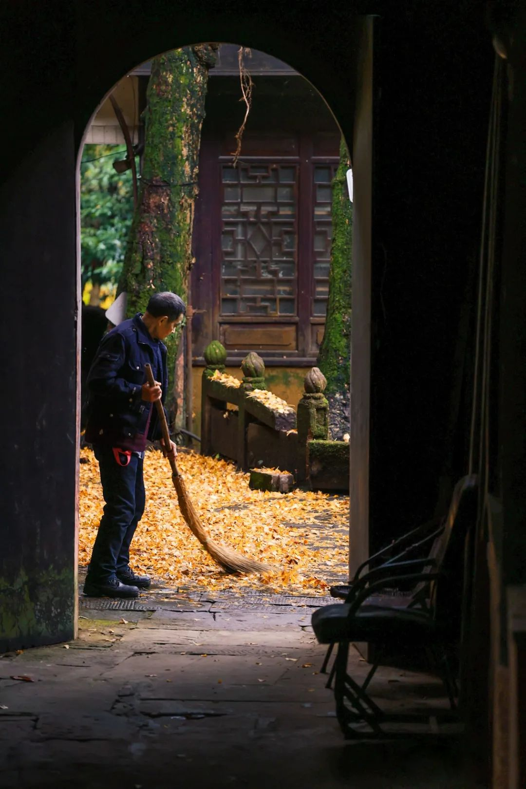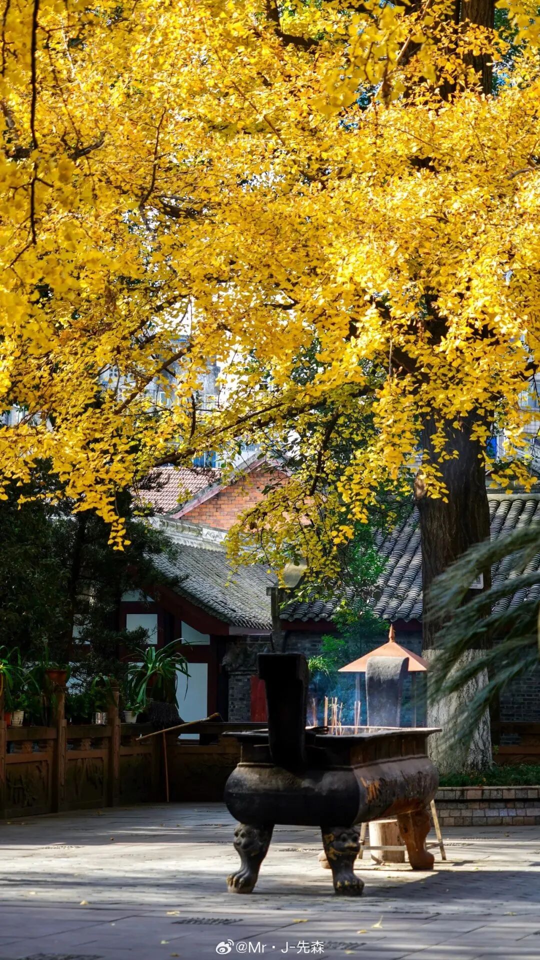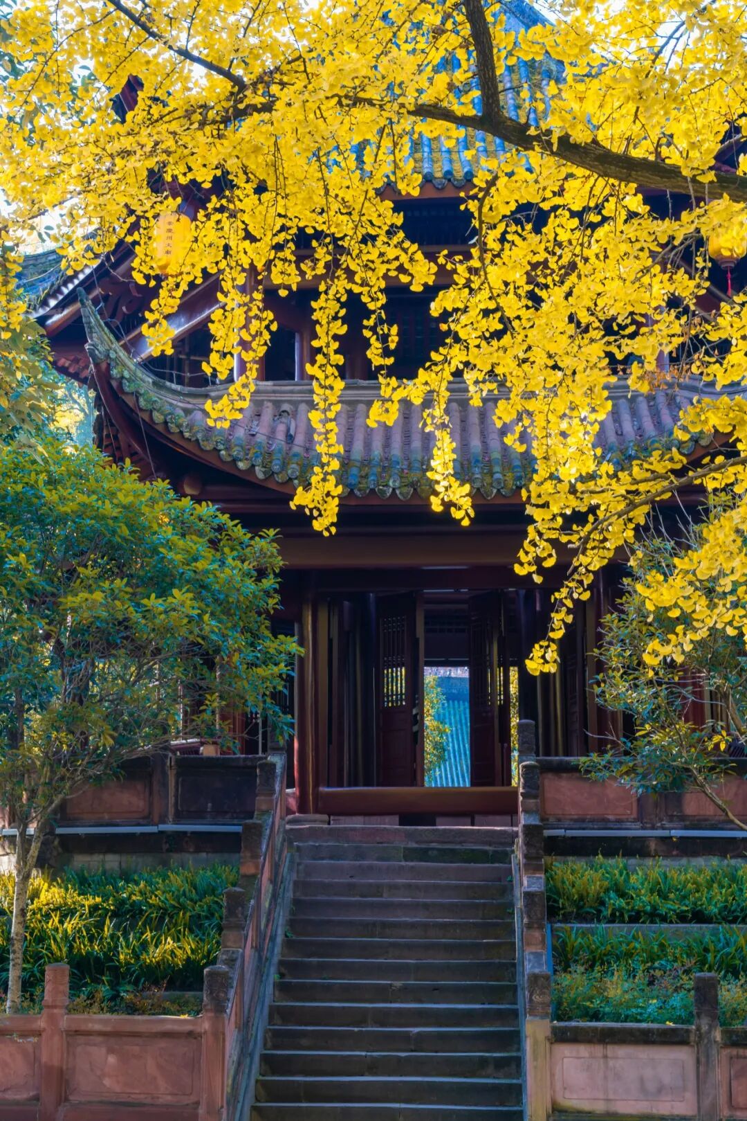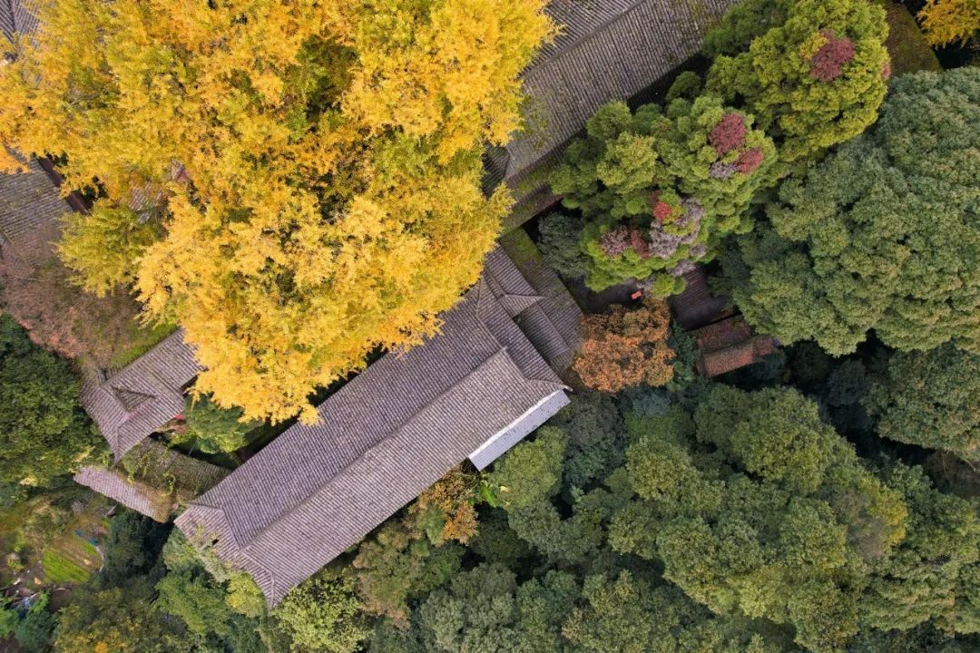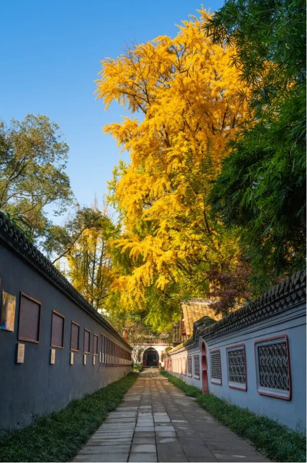 看最美银杏,位于闹市中的文殊院是不可错过之地。不久后,寺内“文殊阁”片区大片的银杏全黄且铺地,美得令人心旷神怡~