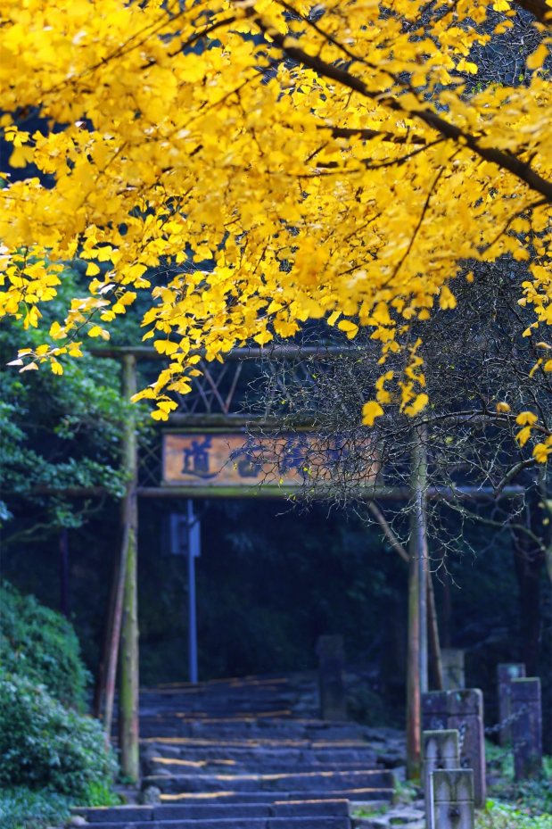 金黄的银杏,给青城山增添了些许神秘色彩。风起叶落,铺满石阶、瓦楞,恍惚间似一种难以言喻的时光倒流之感。